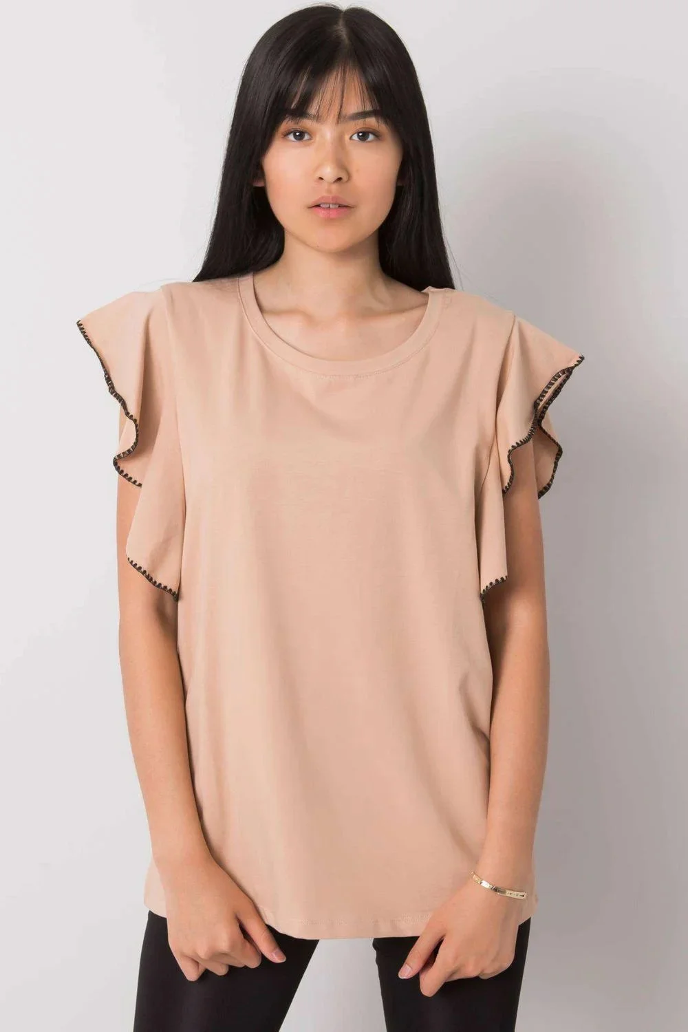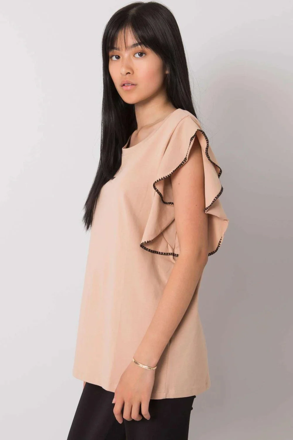 Jednoduchá halenka s krátkými rukávy v podobě volánku a kulatým výstřihem. Ideální pro mnoho příležitostí.
