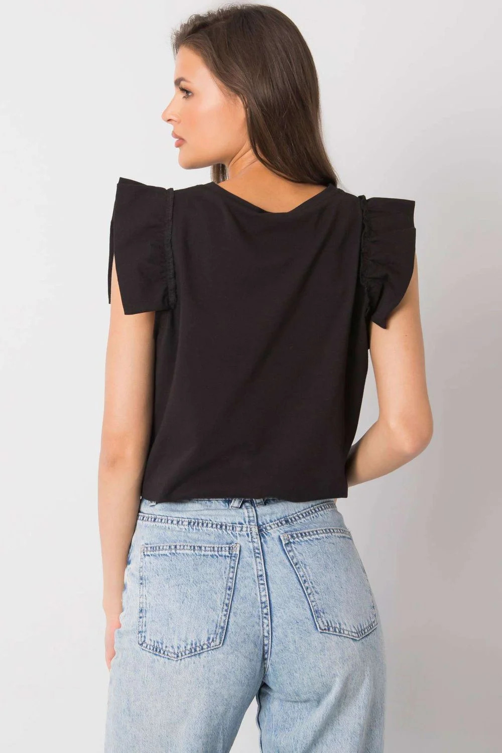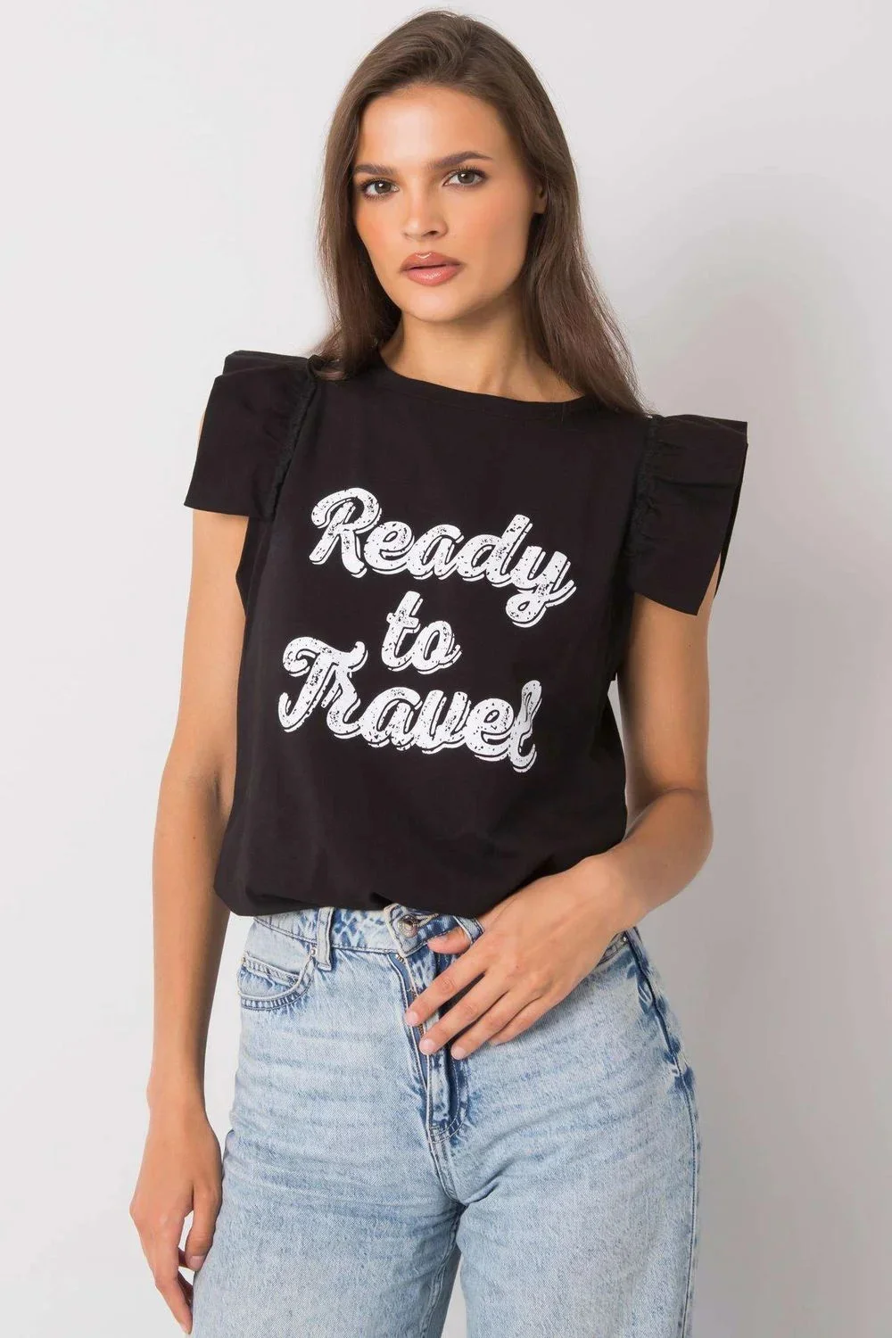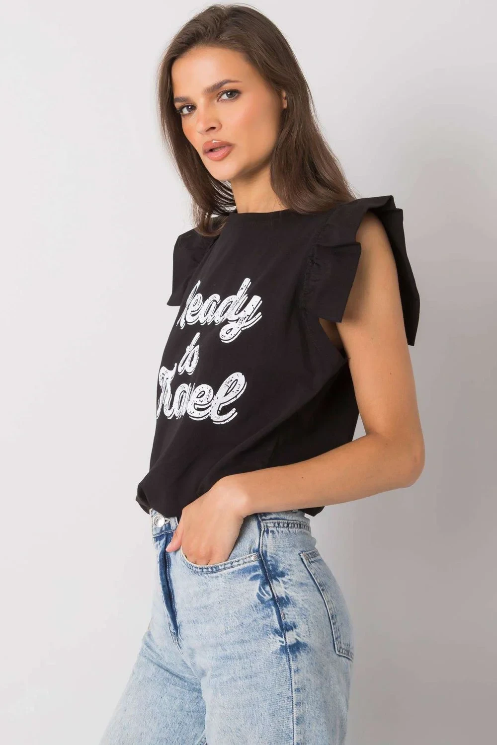 Halenka s krátkými rukávy v podobě volánku a kulatým výstřihem. Ozdobný nápis na přední straně.