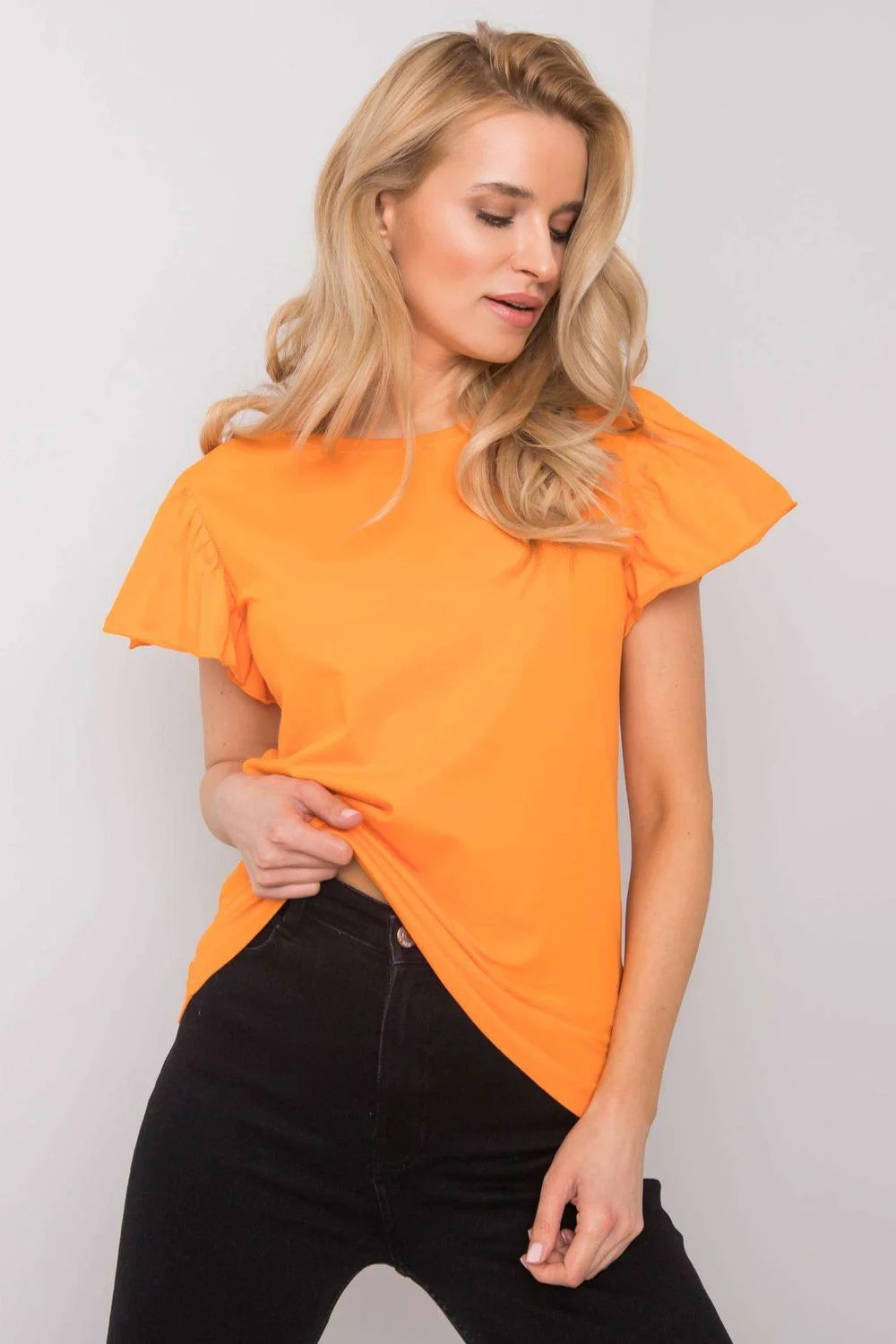 Halenka s krátkými rukávy v podobě volánku a kulatým výstřihem. Návrh ideální pro mnoho příležitostí.