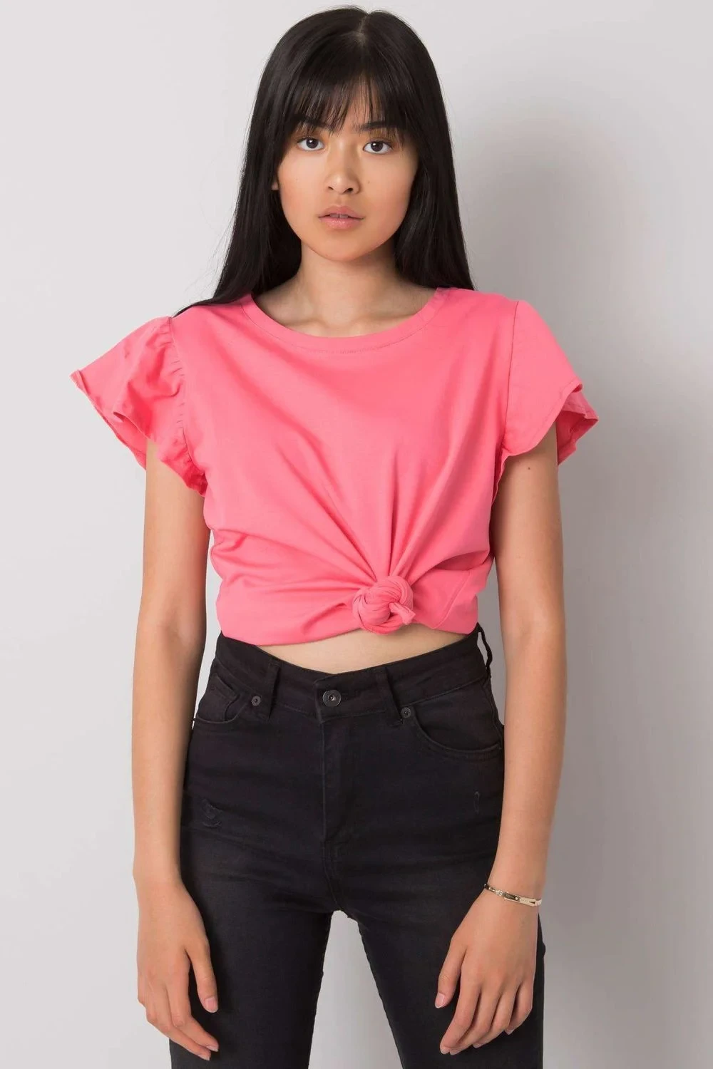 Halenka s krátkými rukávy v podobě volánku a kulatým výstřihem. Ideální pro mnoho příležitostí.