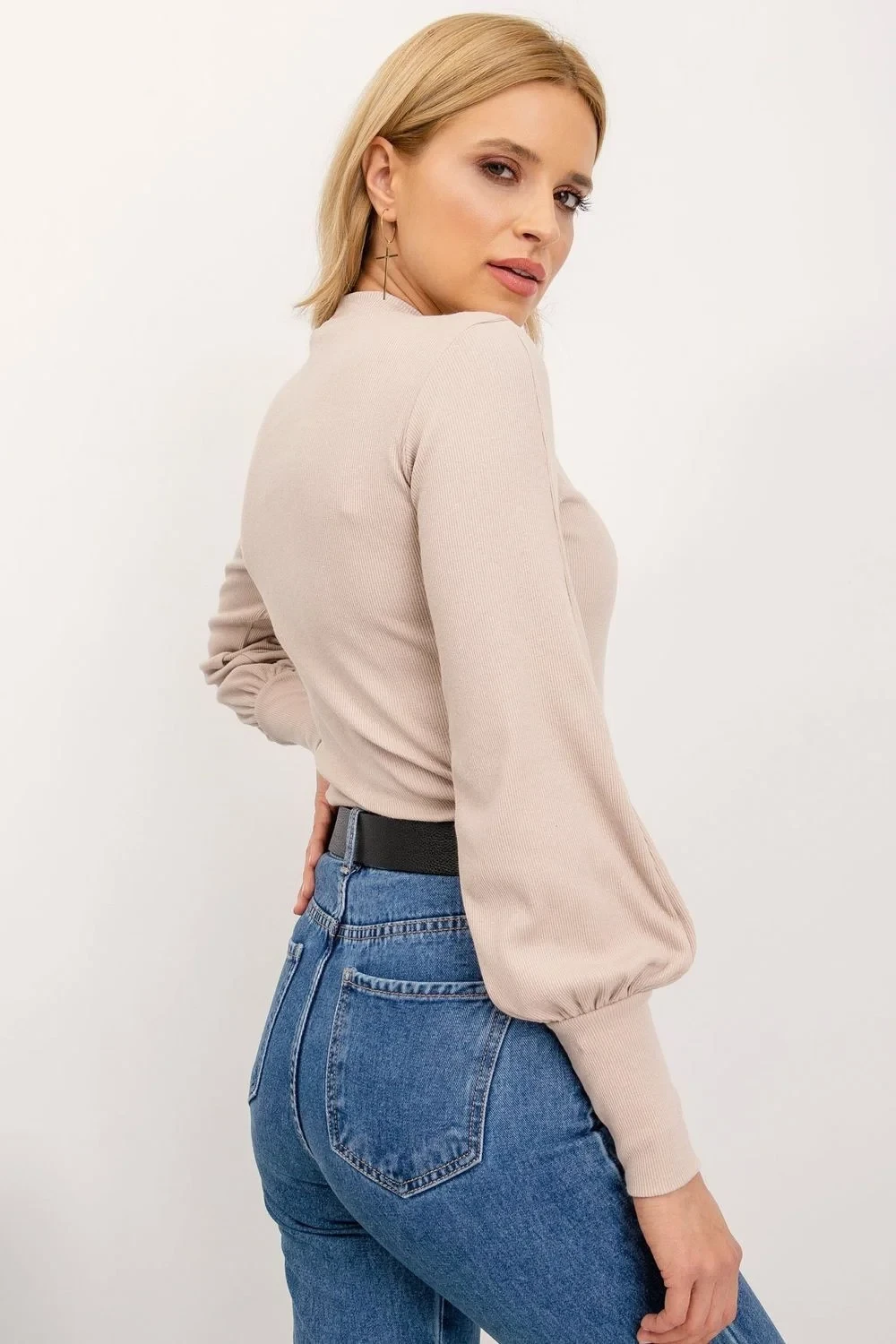 Halenka s dlouhými rukávy z žebrované tkaniny. Rukávy jsou zakončené širokými žebrovanými manžetami.