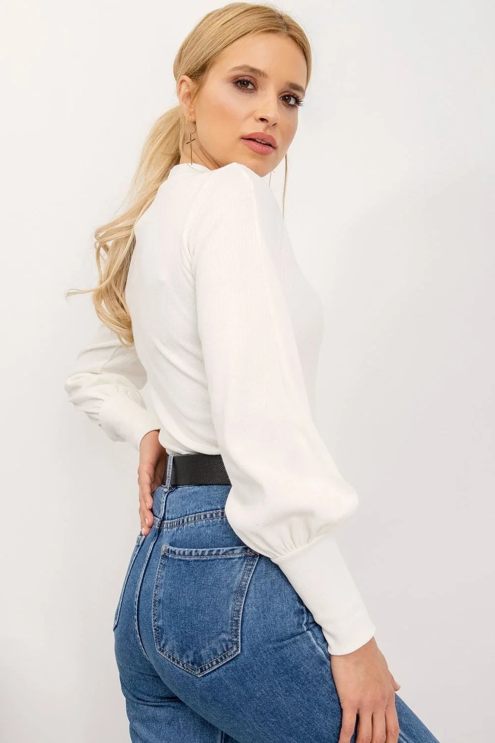 Halenka s dlouhými rukávy z žebrované tkaniny. Rukávy jsou zakončené širokými žebrovanými manžetami.