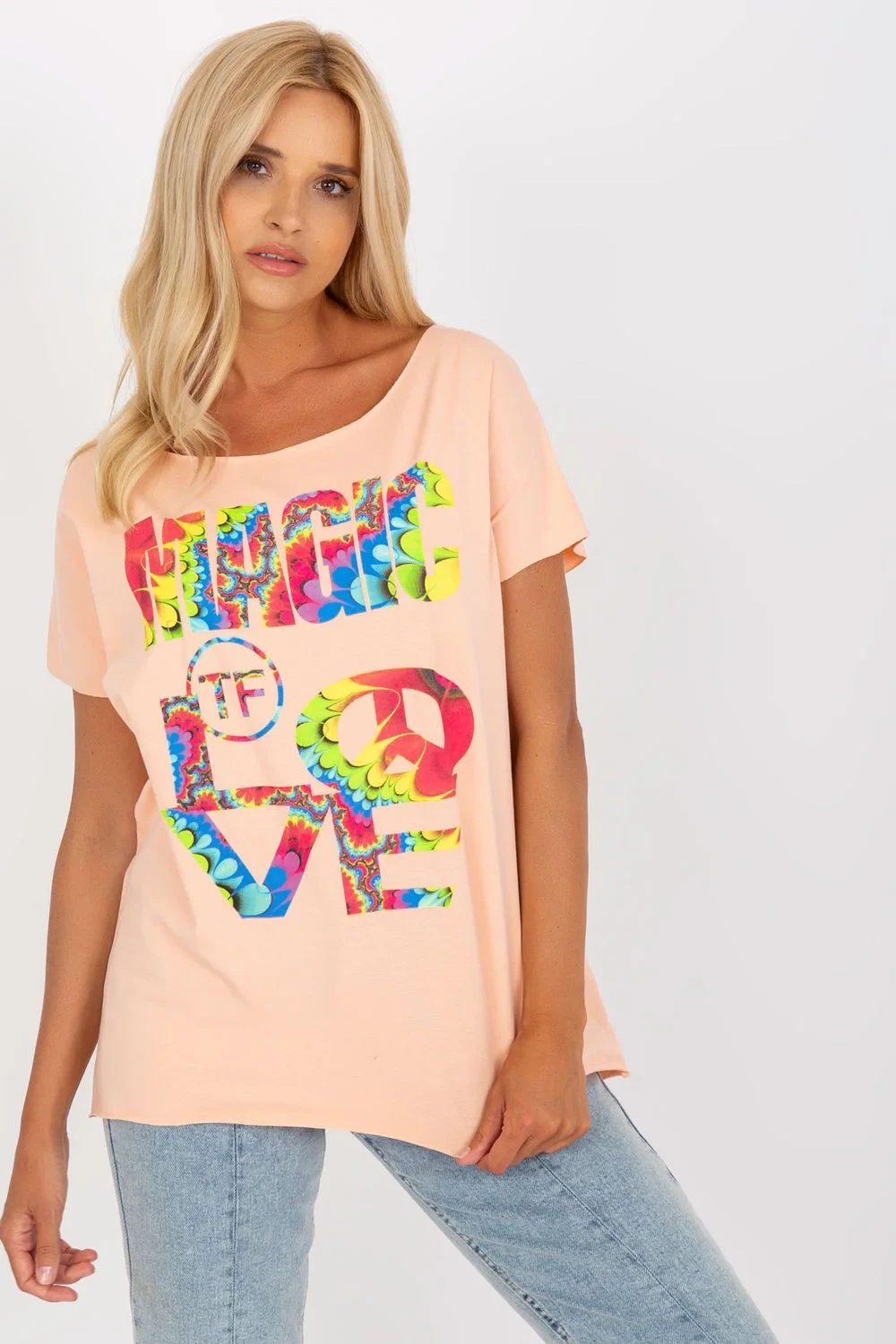 Halenka rovného střihu s krátkými rukávy a ozdobným potiskem na přední straně.
