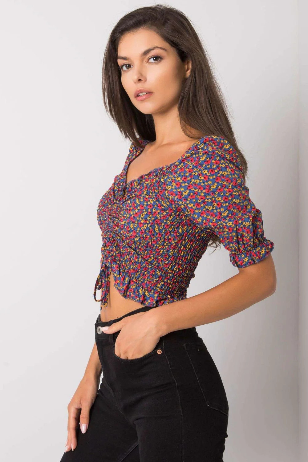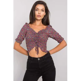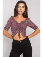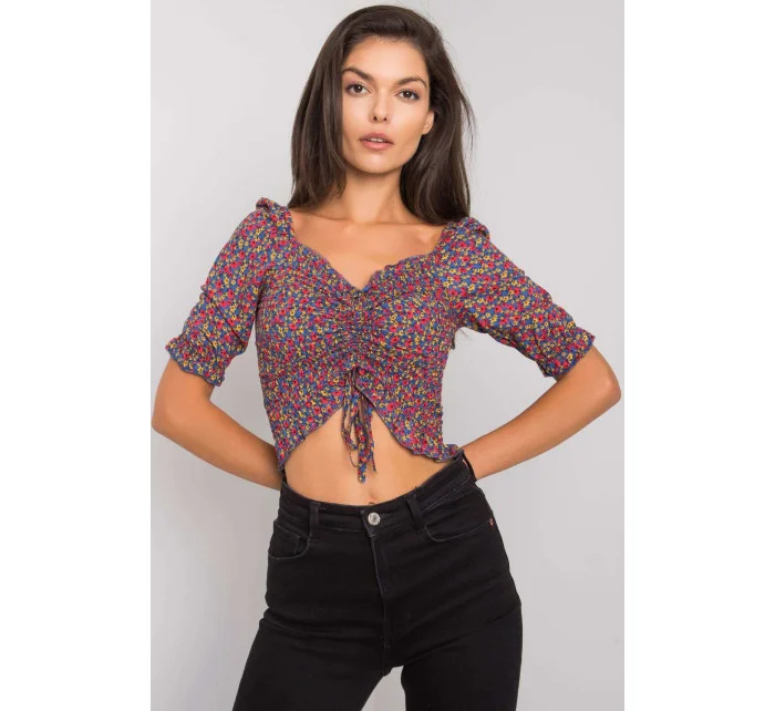 Krátká halenka vypasovaného střihu s krátkými rukávy. Halenka s véčkovým výstřihem, záhyby a vázáním na přední straně.