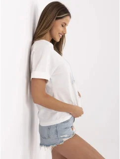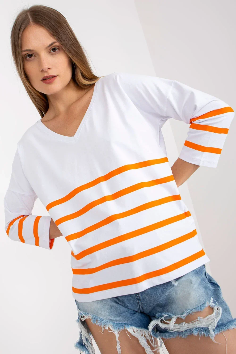 Halenka s 3/4 rukávy a výstřihem do V. Halenka zdobená barevnými pruhy.