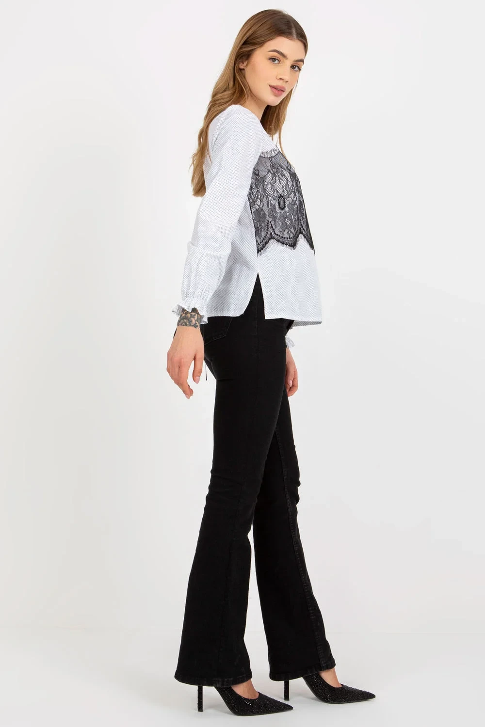 Společenská halenka s dlouhými rukávy, ozdobnou krajkou a vázáním. Skvěle se hodí pro mnoho příležitostí.