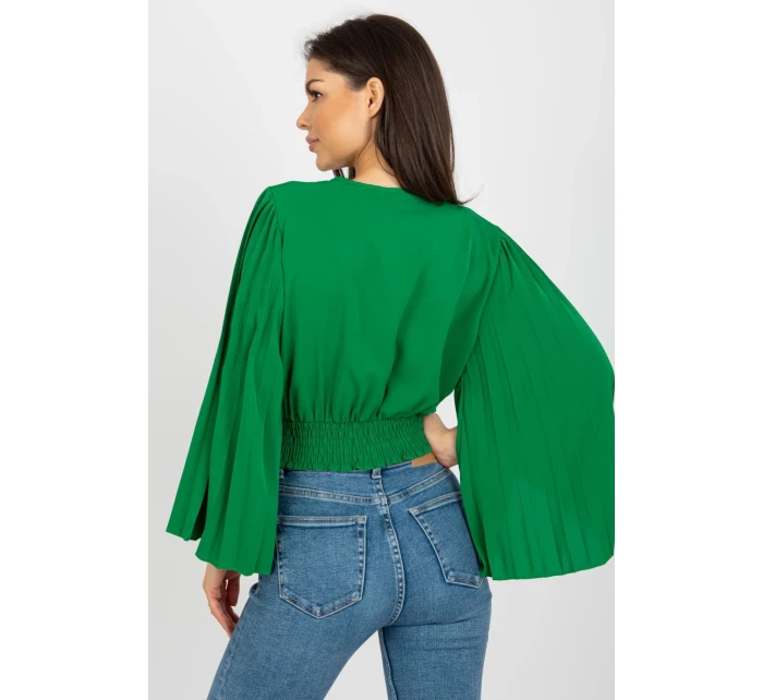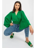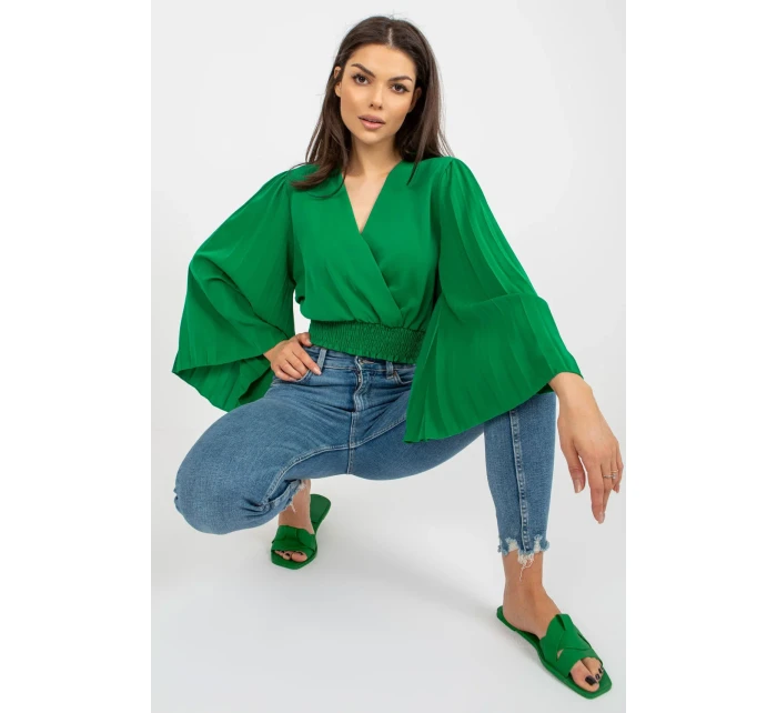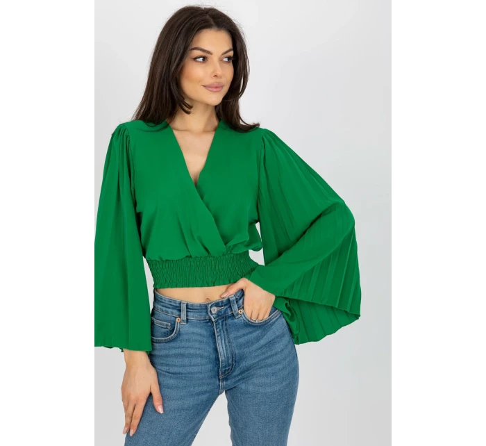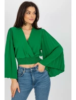 Halenka s obálkovým výstřihem a dlouhými širokými rukávy. Plně nařasené rukávy, široká podpůrná guma ve spodní části halenky.