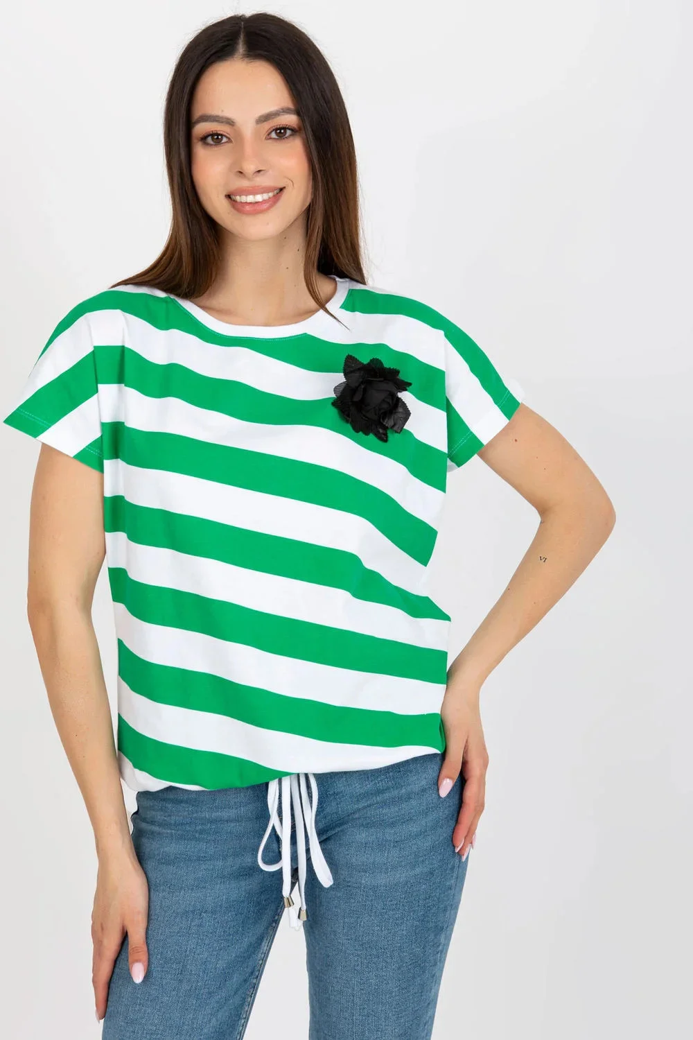 Dámská halenka s krátkými rukávy a kulatým výstřihem v barevných pruzích. Ozdobná brož ve tvaru květiny na přední straně.