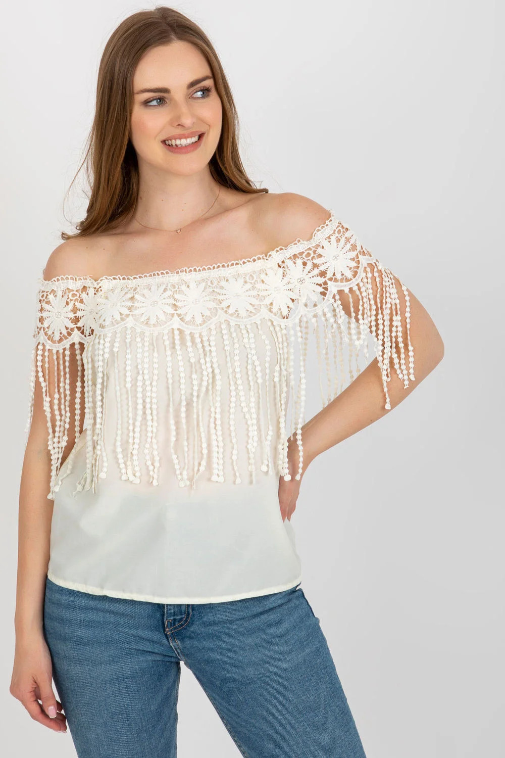 Letní halenka s výstřihem ve španělském stylu. Halenka zdobená ozdobnou krajkou se střapci.