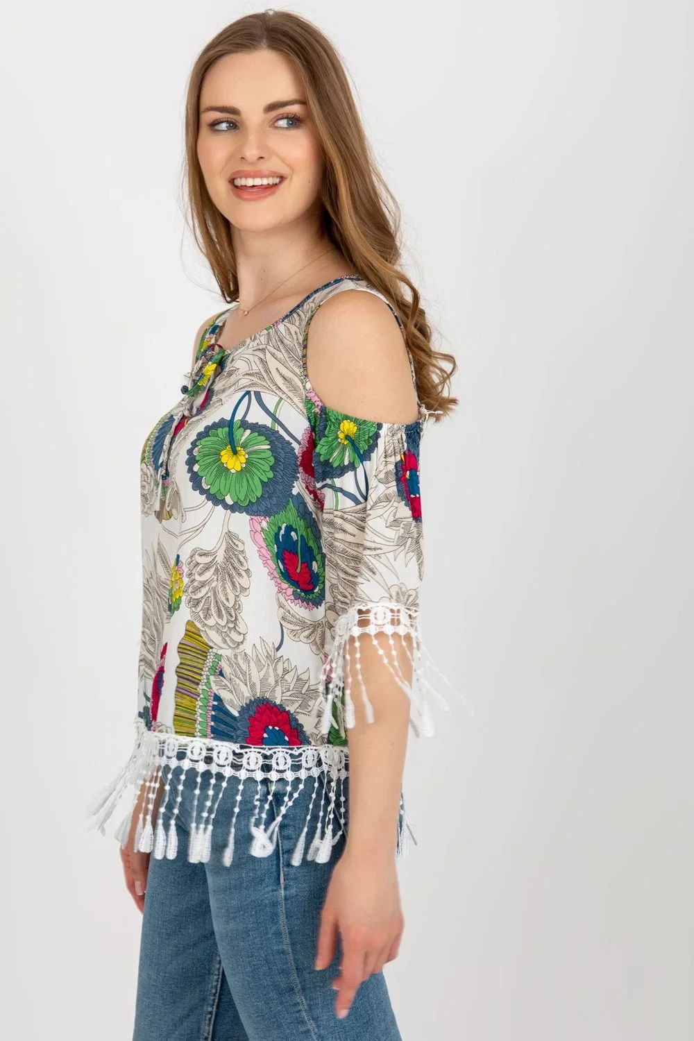 Letní halenka z potištěné látky s 3/4 rukávy a kulatým výstřihem. Halenka se zavazováním ve výstřihu a ozdobnými střapci.