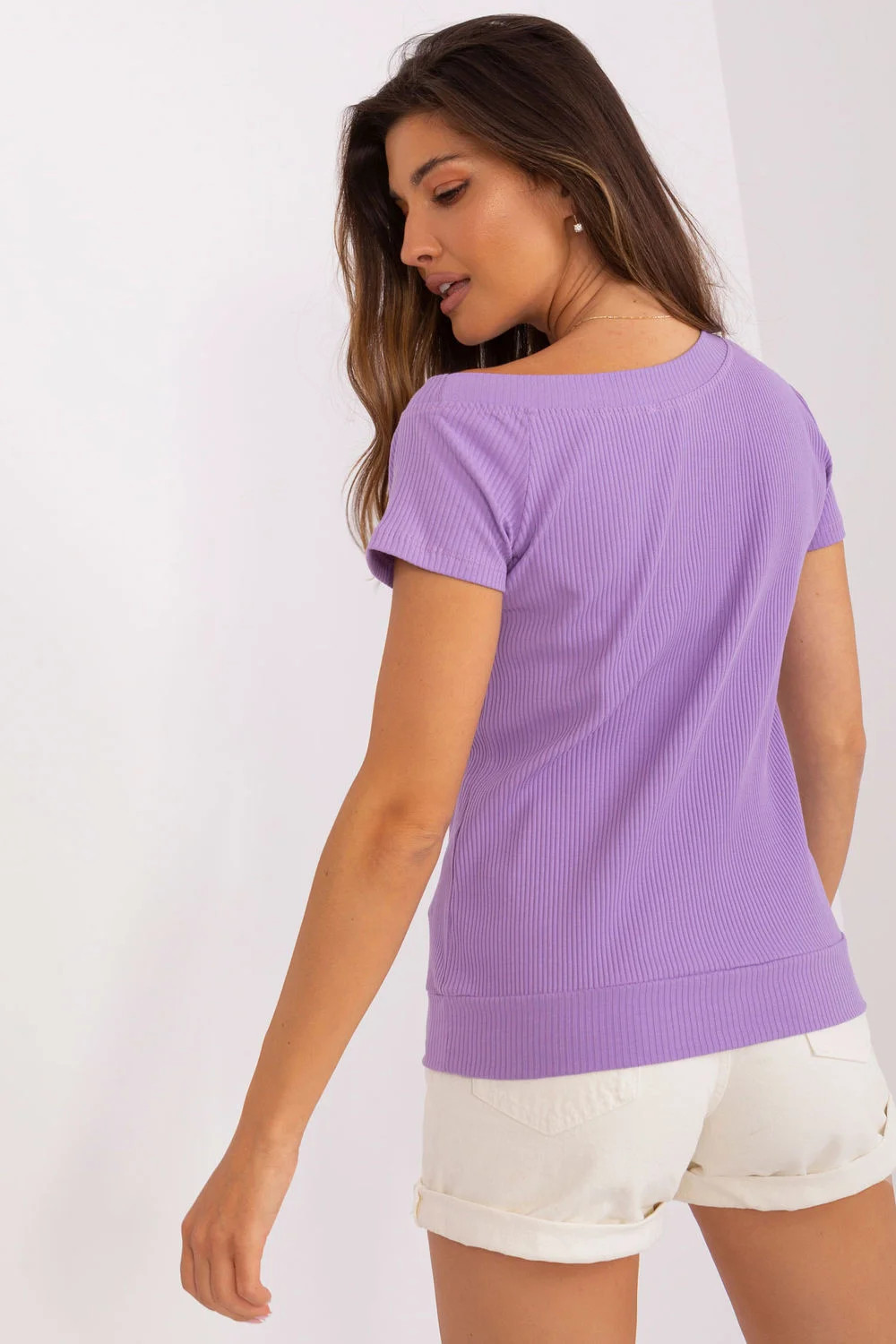 Halenka s krátkými rukávy a symetrickým výstřihem. Halenka vypasovaného střihu, vyrobená z žebrované tkaniny.