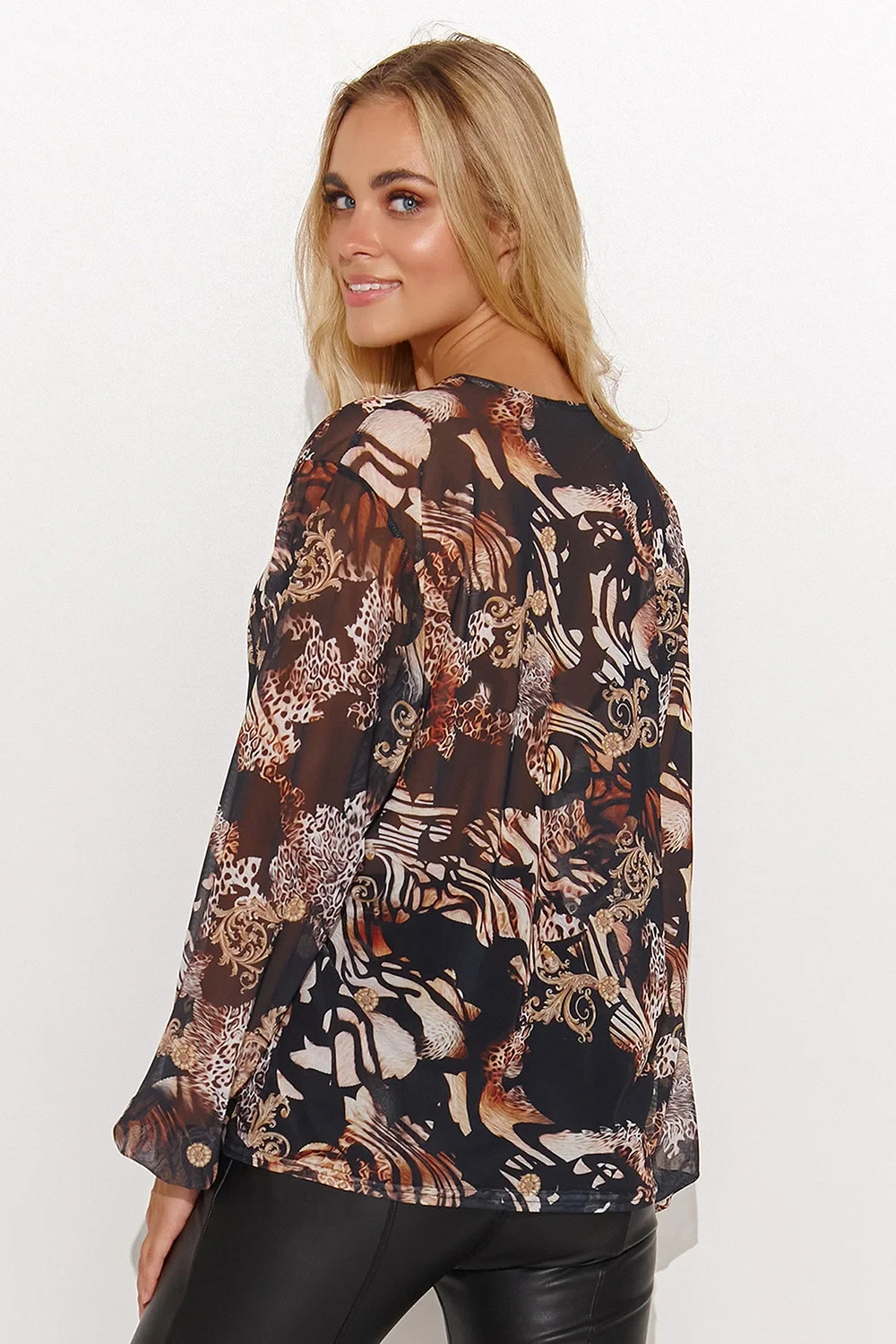 Dámská síťovaná halenka volného střihu, dostupná v 5 provedeních s různými motivy a zajímavými barvami. Má výstřih do V a ležérní dlouhé rukávy. Můžete ji nosit s džínami pro ležérní vzhled nebo s elegantními kalhotami či sukní a jehlovými podpatky pro zvláštní příležitost! Podtrhne vaši eleganci a dokonale se zkombinuje s vaším stylem. Spojte pohodlí s rafinovaností a užijte si módu jako nikdy předtím.