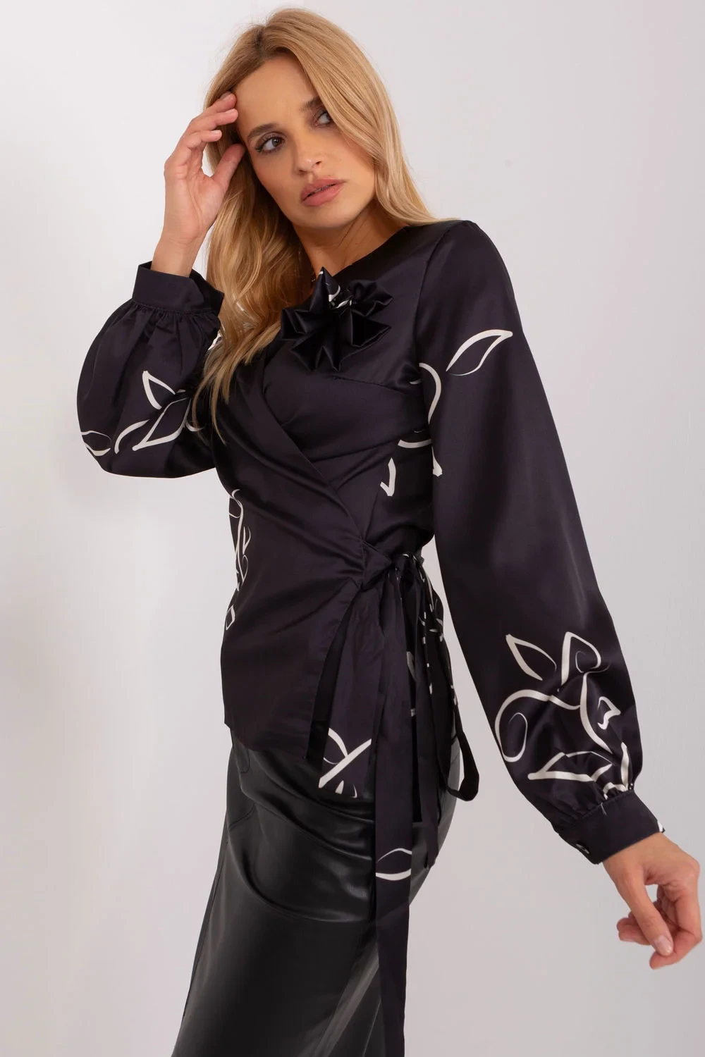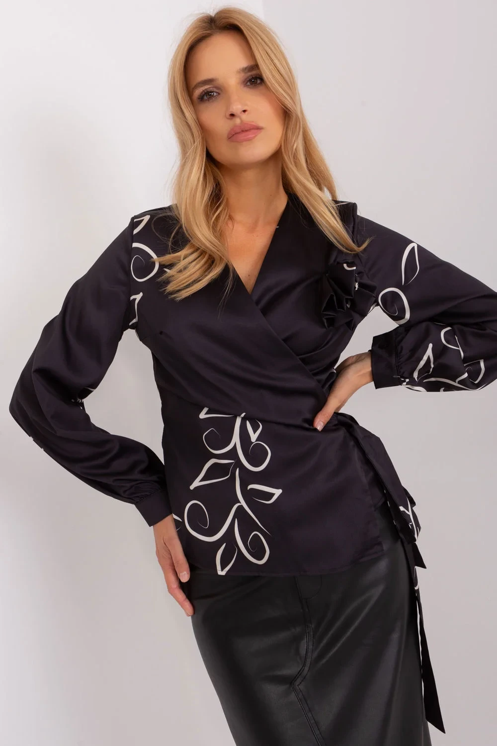 Společenská halenka s obálkovou přední částí s vázáním. Halenka s výstřihem do V a dlouhými rukávy. Halenka z látky se zajímavým vzorem.