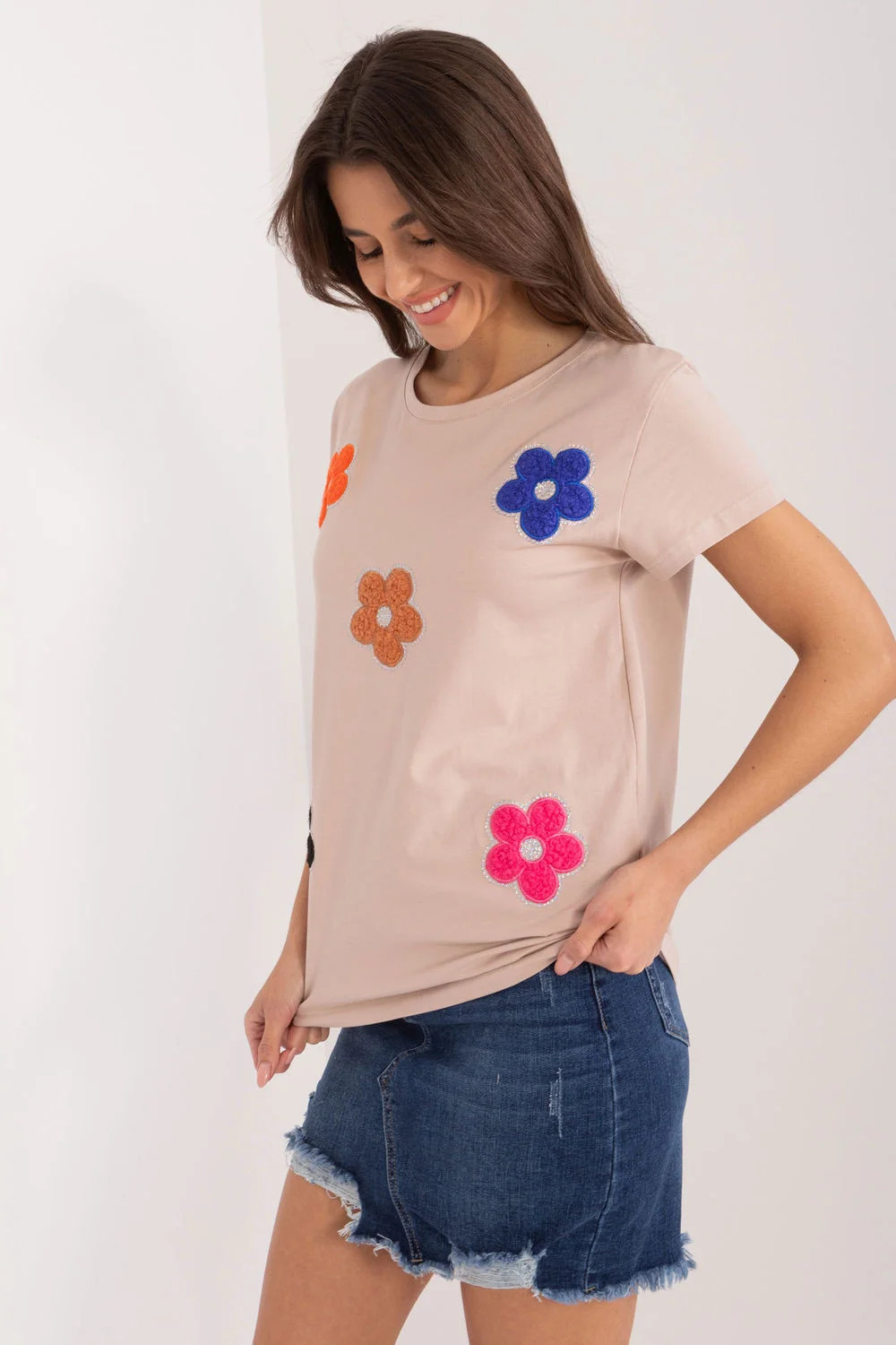 Tato halenka je ideální volbou pro ty, kdo hledají ležérní, ale roztomilý kousek do šatníku. Je vyrobena z kvalitní bavlny a zaručuje pohodlné nošení po celý den. Její design sází na jednoduchost, ale je zdobena decentním, ale nápadným způsobem. Na předním díle jsou půvabné květy, jejichž krásu podtrhují drobné zirkony. Toto jemné zdobení dodává halence zvláštní kouzlo a díky němu se hodí pro mnoho příležitostí. Halenka má standardní délku a krátké rukávy, takže je ideální pro letní dny. Výstřih je kulatý, což jí dodává univerzálnost a je vhodná k různým outfitům. Je ideální volbou pro ty, kteří ocení jednoduchost s nádechem elegance, ideální pro každodenní nošení. Lze ji snadno kombinovat s různými kalhotami nebo sukněmi a vytvářet tak stylové a pohodlné outfity pro každodenní nošení.