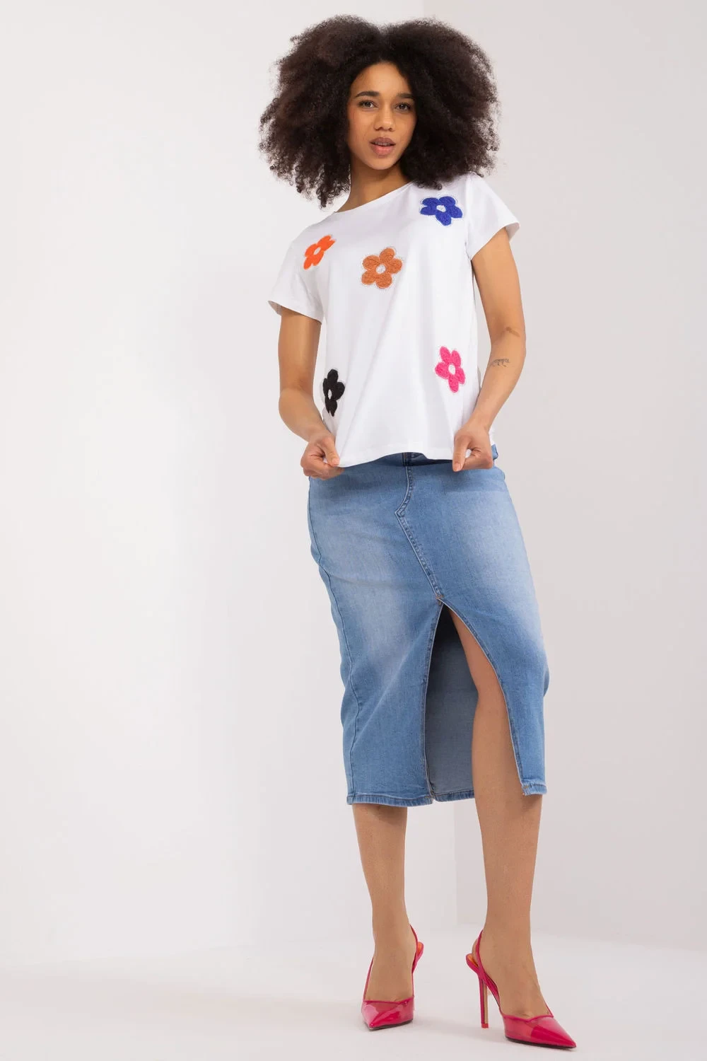 Tato halenka je ideální volbou pro ty, kdo hledají ležérní, ale roztomilý kousek do šatníku. Je vyrobena z kvalitní bavlny a zaručuje pohodlné nošení po celý den. Její design sází na jednoduchost, ale je zdobena decentním, ale nápadným způsobem. Na předním díle jsou půvabné květy, jejichž krásu podtrhují drobné zirkony. Toto jemné zdobení dodává halence zvláštní kouzlo a díky němu se hodí pro mnoho příležitostí. Halenka má standardní délku a krátké rukávy, takže je ideální pro letní dny. Výstřih je kulatý, což jí dodává univerzálnost a je vhodná k různým outfitům. Je ideální volbou pro ty, kteří ocení jednoduchost s nádechem elegance, ideální pro každodenní nošení. Lze ji snadno kombinovat s různými kalhotami nebo sukněmi a vytvářet tak stylové a pohodlné outfity pro každodenní nošení.