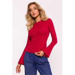 Přeložený text: Přizpůsobená halenka vyrobená z pruhované bavlněné pleteniny, ideální pro každodenní stylizace. Má dlouhé rukávy, které jsou lehce rozšířené na spodní části a dokončené dekorativním lemováním, které přidává jemnou eleganci. Navržena a vyrobena v Polsku, halenka kombinuje pohodlí a styl.