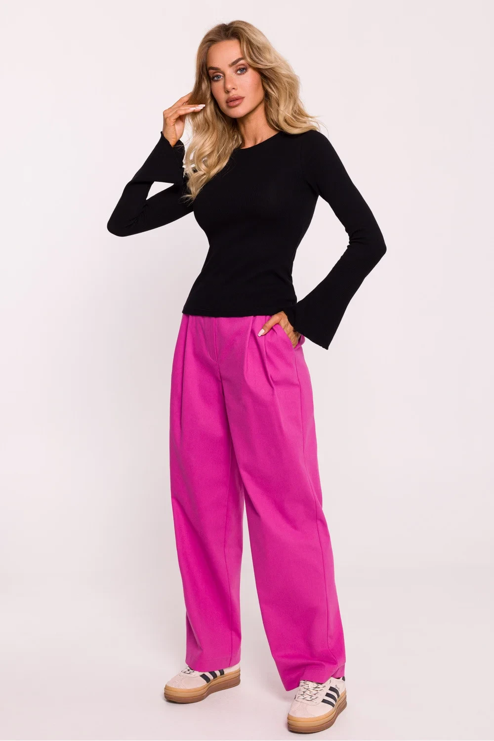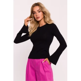 Přeložený text: Přizpůsobená halenka vyrobená z pruhované pleteniny bavlny, ideální pro každodenní stylizace. Má dlouhé rukávy, které jsou lehce rozšířené u spodu a zdobené dekorativním lemováním, které dodává subtilní eleganci. Navržena a ušita v Polsku, halenka spojuje pohodlí a styl.