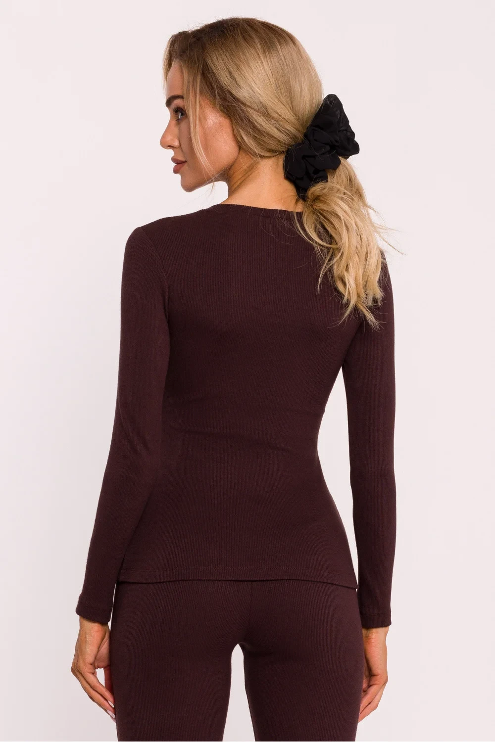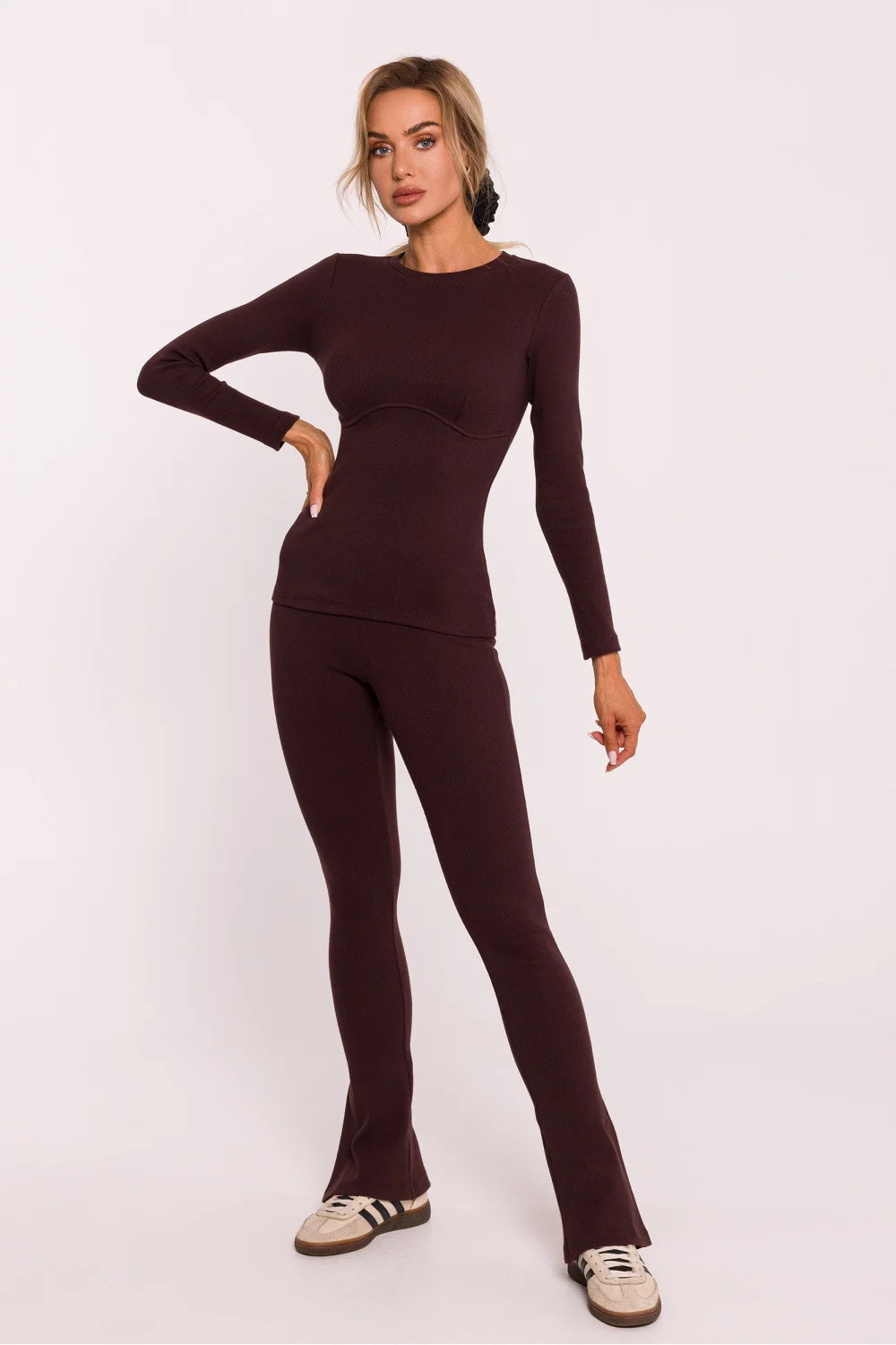 Tato dlouhá halenka s úzkými rukávy, která je vyrobena z žebrovaného bavlněného úpletu, dokonale přiléhá k postavě a zvýrazní vaše křivky. Udržovaná v korzetovém střihu kombinuje klasickou eleganci s moderním designem, což celku dodává ženský a smyslný charakter. Ideální pro běžné nošení i pro zvláštní příležitosti. Halenka byla navržena a ušita v Polsku, což zaručuje vysokou kvalitu materiálů a precizní zpracování.
