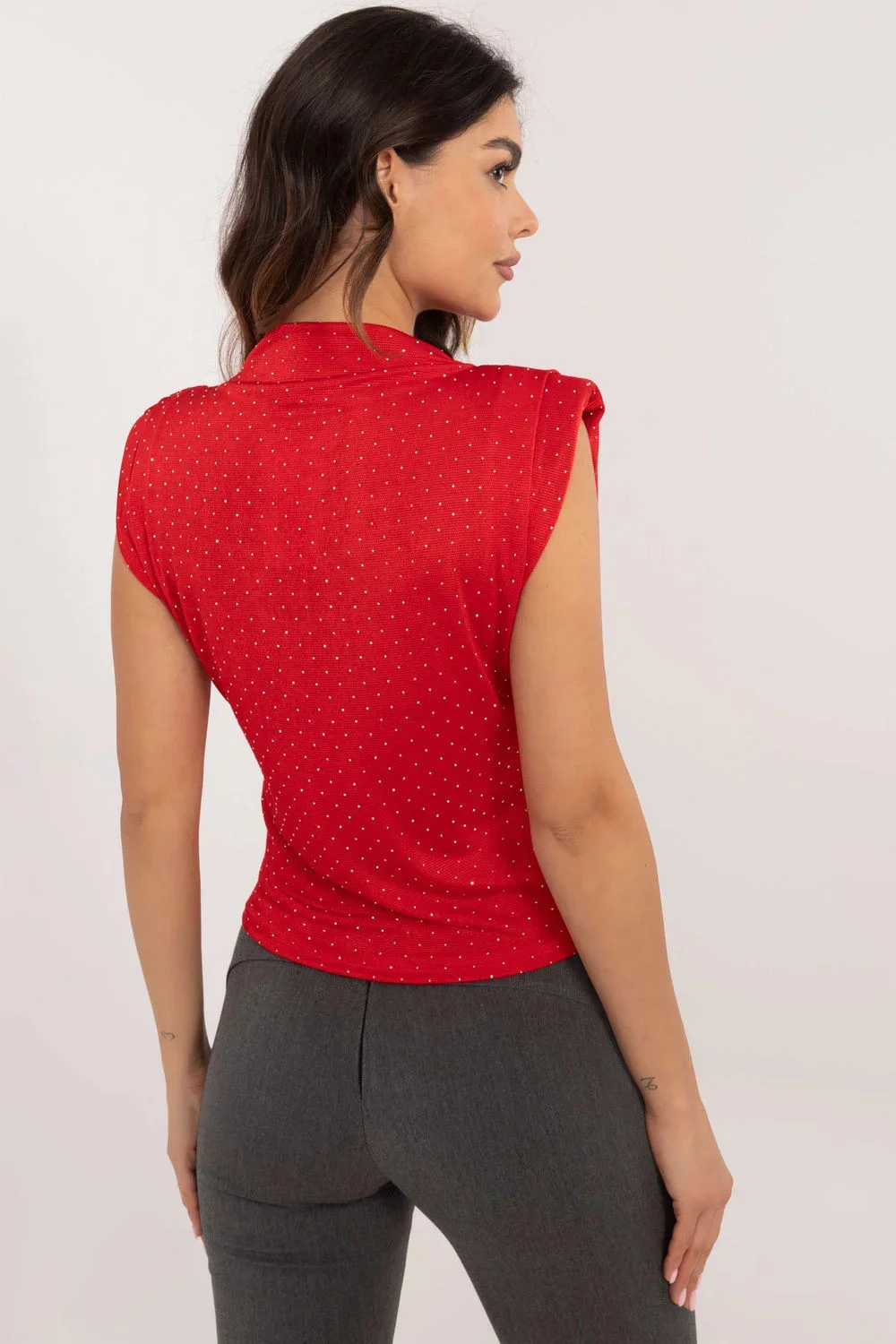 Elegantní blůzka ideální na formální události, do práce i na večírky. Vyrobena z vysoce kvalitní směsi polyesteru a elastanu, poskytuje pohodlí a skvělé přizpůsobení postavě. Má vestavěné ramenní polštářky, které jí dodávají strukturu a eleganci a decentně zdůrazňují ramena. Blůzka má standardní délku a bez rukávů, co jí dodává moderní a lehký charakter. Kulatý výstřih se harmonicky hodí k celku a ozdobné flitry rozmístěné po celém materiálu jí dodávají lesk a sofistikovanost. Je to perfektní volba pro ženy, které oceňují styl a eleganci.