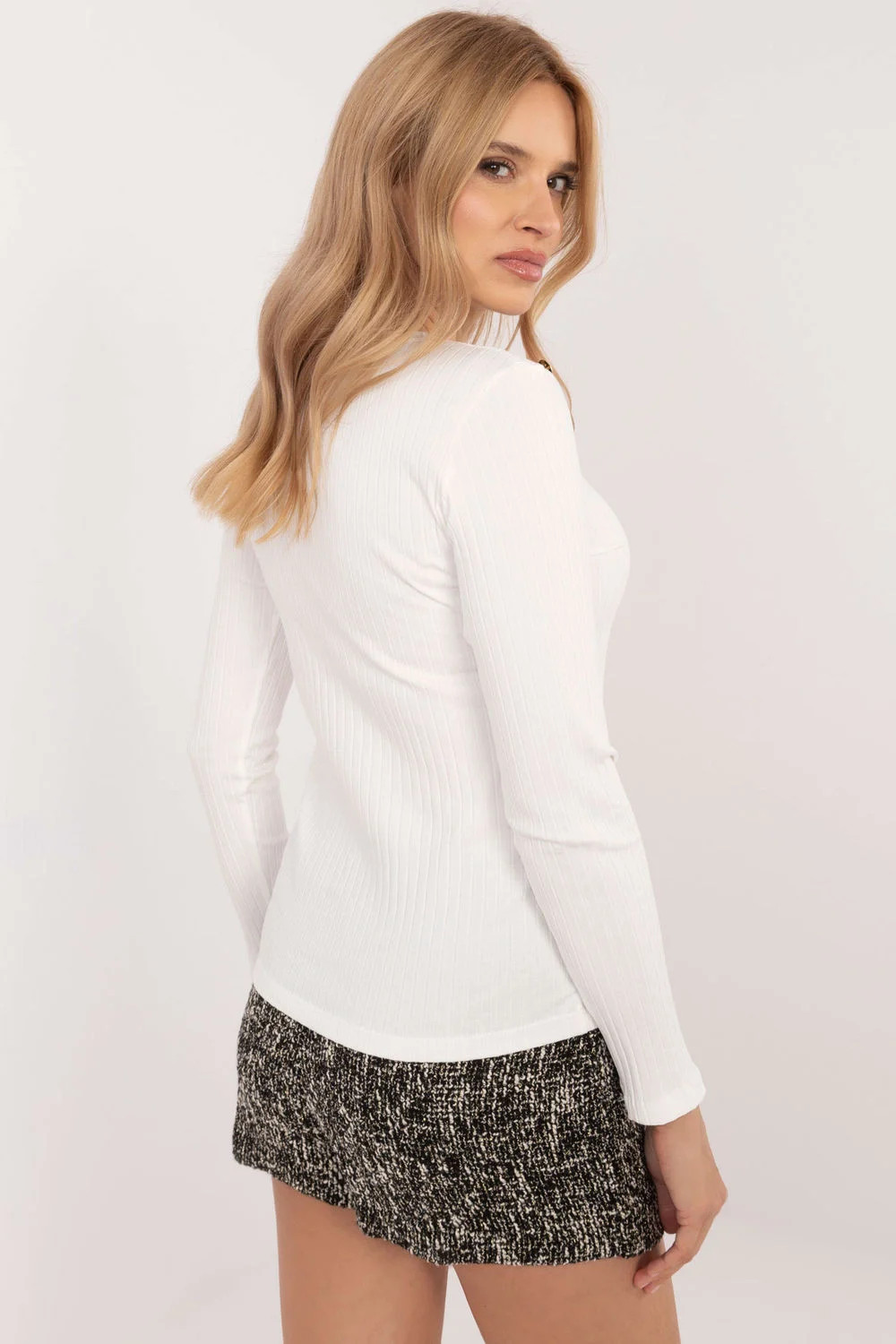 Přizpůsobený top z pruhované látky, skvělý na každý den i do práce, v elegantním stylu. Vyrobený z vysoce kvalitní směsi bavlny a elastanu, poskytuje pohodlí a ideální přizpůsobení postavě. Top má hladký vzor, standardní délku a dlouhé rukávy. Výstřih do V a manžety jsou zdobeny decentním motivem zvířat, což dává celku výrazný charakter. Navíc na zápěstích a výstřihu jsou knoflíky, které slouží jako ozdoba. Pružná látka přidává eleganci a potisk ve formě motivu zvířat zdůrazňuje unikátnost tohoto modelu.