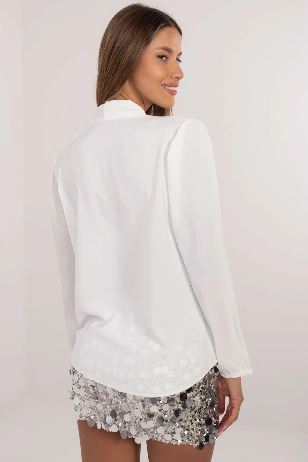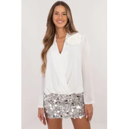 Sofistikovaná a stylová halenka, která se skvěle hodí pro slavnostní příležitosti i do práce. Je vyrobena z vysoce kvalitní směsi polyesteru, viskózy a elastanu a zaručuje pohodlné nošení a elegantní vzhled po celý den. Elegantní styl, ideální na formální schůzky, oslavy nebo do kanceláře. Srdíčkový výstřih, který jemně zvýrazňuje dekolt a výstřih a dodává halence ženský nádech. Dlouhý rukáv, vhodný pro všechna roční období. Spodní část lemovaná gumou pro vypasovaný střih a mírně volný, ale vyvážený střih. Ozdobná látková květina na přední straně poskytuje výrazný akcent jedinečného designu. Blůza standardní délky se skvěle kombinuje s elegantními kalhotami, sukněmi nebo džínami a vytváří elegantní a všestranný vzhled. Je nepostradatelným kouskem v šatníku každé ženy, která ocení eleganci a pohodlí.