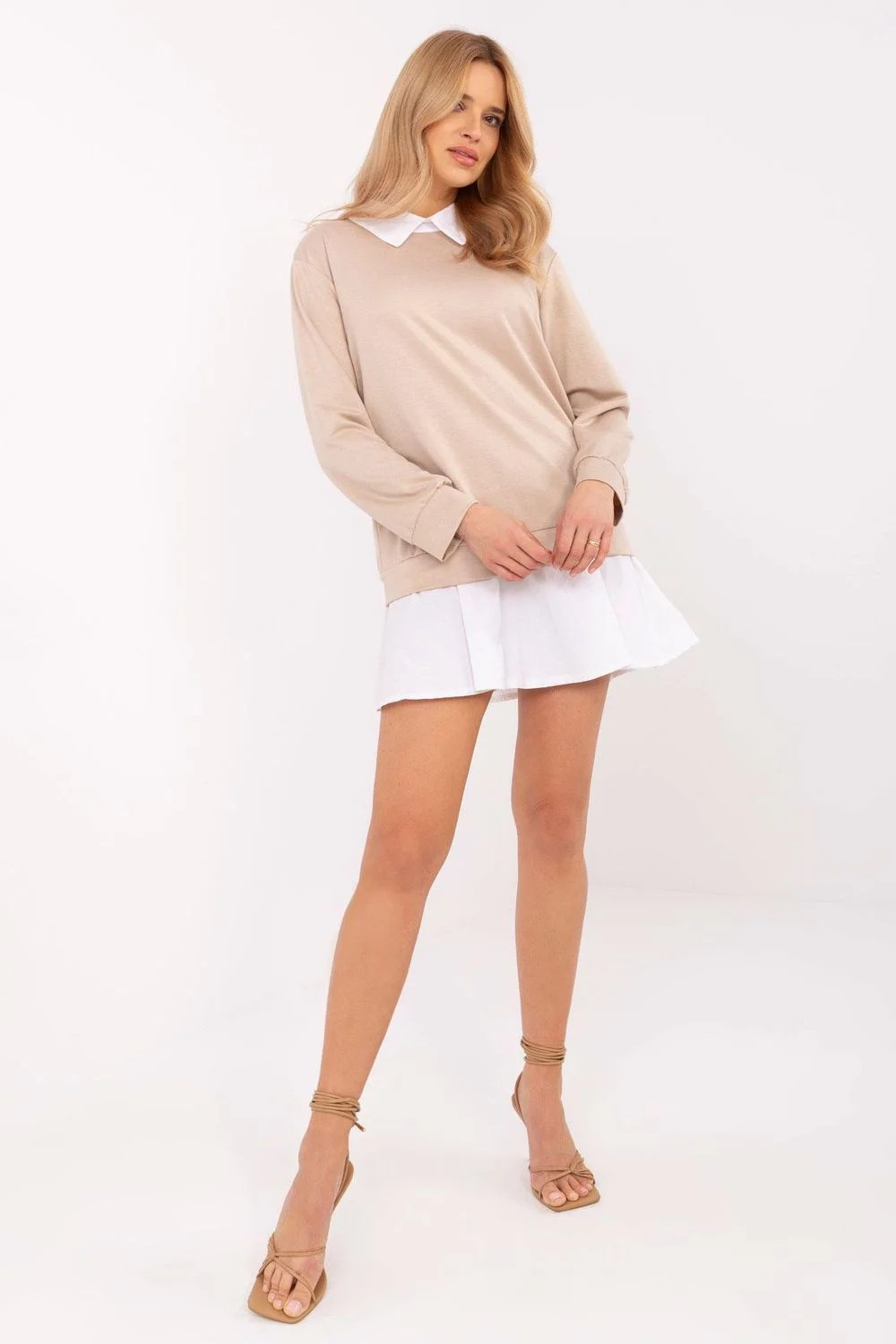 Elegantní a pohodlný top s casualovým charakterem, ideální na každodenní nošení i do práce. Vyrobený z příjemné směsi viskózy, bavlny a elastanu, poskytuje pohodlí a skvělé přizpůsobení postavě. Model je zdoben klasickým límcem a košilovým lemem dole, který dodává eleganci a jemně zdůrazňuje stylizaci. Hladký vzor činí top mimořádně univerzálním a snadno kombinovatelným s dalšími kousky šatníku. Dlouhý rukáv z něj činí skvělou volbu jak pro chladnější dny, tak i pro teplejší, jako základ pod sako nebo kardigan. Jedná se o skvělou volbu pro ženy, které ocení spojení klasiky a pohodlí v každodenních stylizacích.