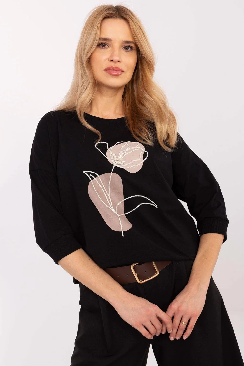 Každodenní košile s hlavou, ideální na každý den i do práce. Vyrobeno z vysoce kvalitní bavlny s přídavkem elastanu, poskytuje pohodlí a skvělé padnutí. Model standardní délky s 3/4 rukávem se hodí do různých stylizací. Hlavním ozdobným prvkem je efektní potisk spojený s vyšívaným, doplněný subtilními perlami, které dodávají eleganci a ženský půvab. Košile skvěle ladí jak s džínami, tak s sukní, vytvářející stylový a pohodlný outfit na každou příležitost.