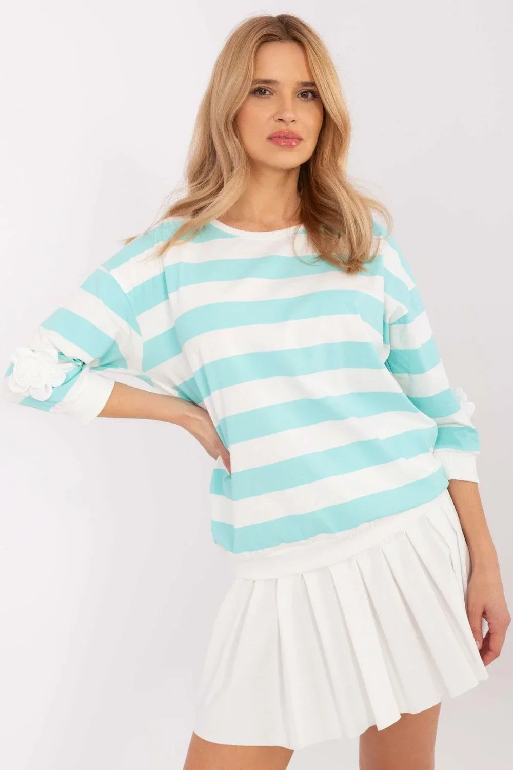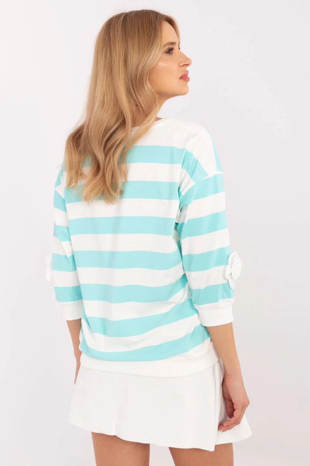 Casualní tričko s hlavou, ideální na každý den i do práce. Vyrobeno z měkké a prodyšné bavlny s přídavkem elastanu, poskytuje pohodlí a volnost pohybu. Model standardní délky s rukávem 3/4 se skvěle hodí do různých stylizací. Dominantní vzor v širokých proužcích dodává tričku módní a nadčasový charakter. Další výhodou jsou dekorativní květinové nášivky umístěné na rukávech, které dodávají jemnou eleganci. Skvělá volba jak k džínám, tak k elegantnějším kalhotám nebo sukním.