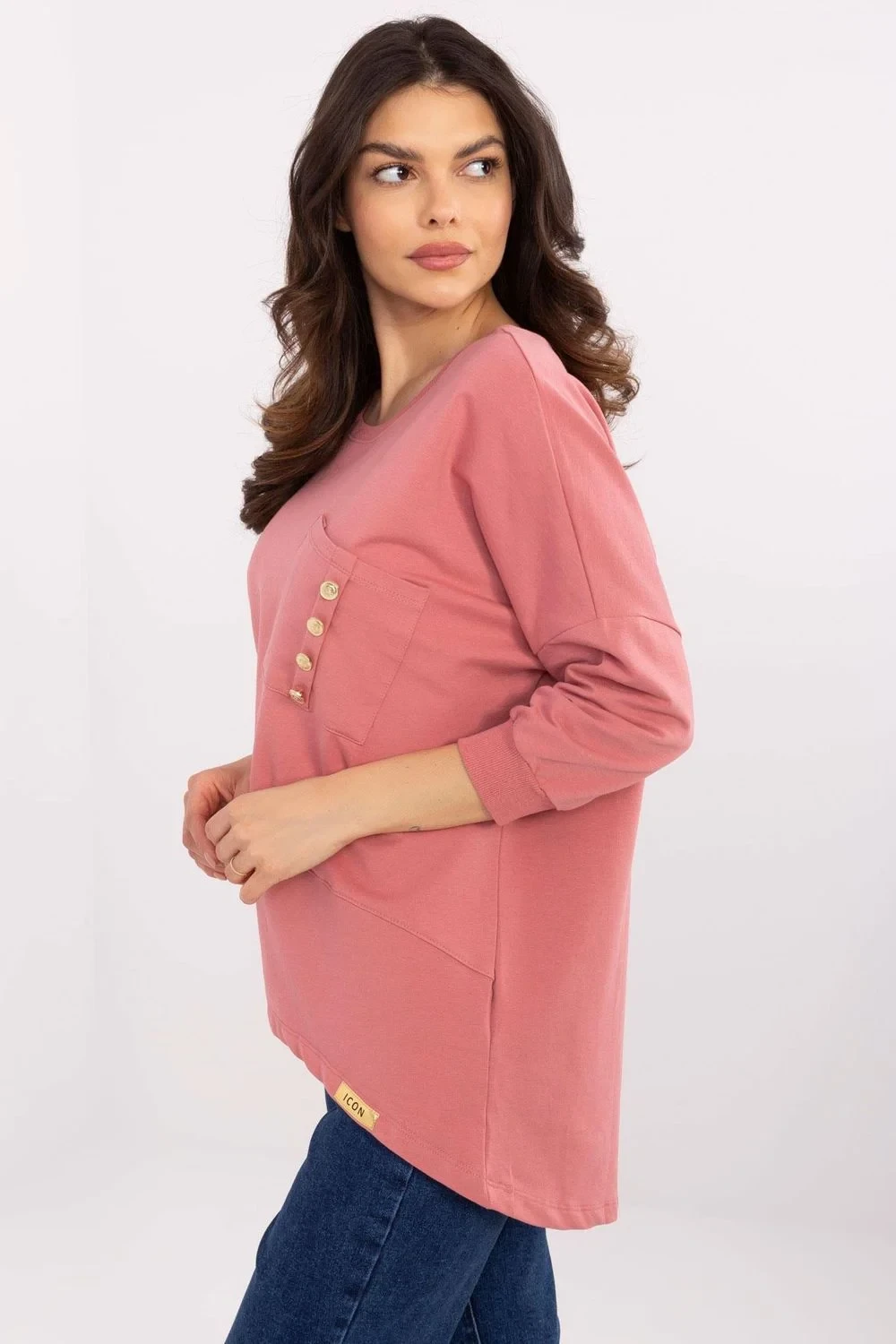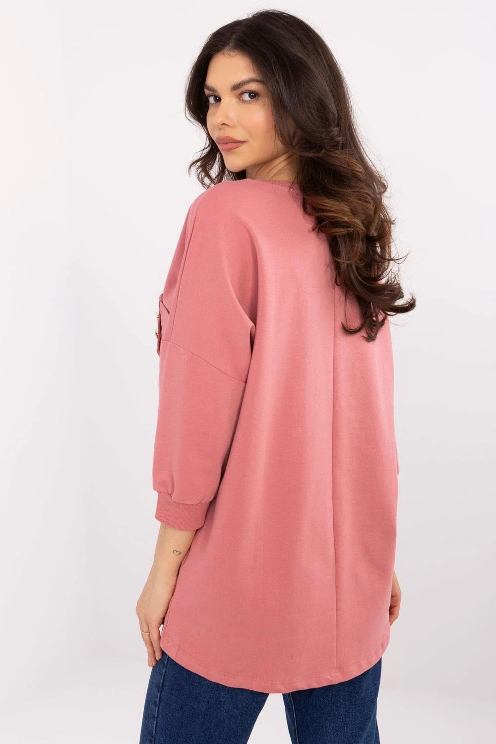 Elegantní a pohodlná každodenní blůza vyrobena z vysoce kvalitní bavlny s přídavkem elastanu. Model z hladké látky, s kulatým výstřihem a rukávem 3/4, poskytuje pohodlí každodenního nošení. Délka blůzy jí skvěle ladí jak s džíny, tak s elegantními kalhotami. Na přední straně je praktická kapsa zdobená dekorativními knoflíky, která dodává jemný půvab.