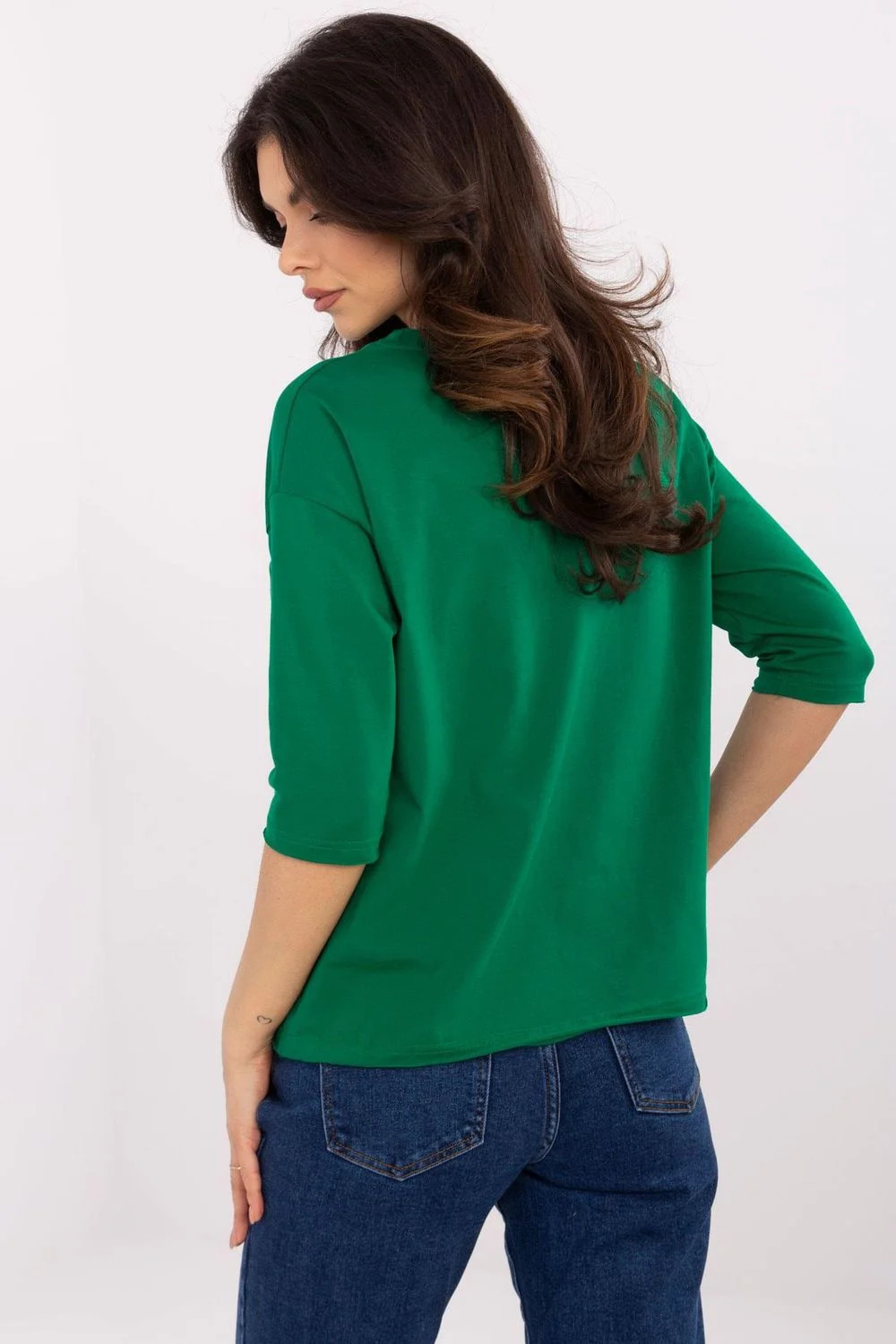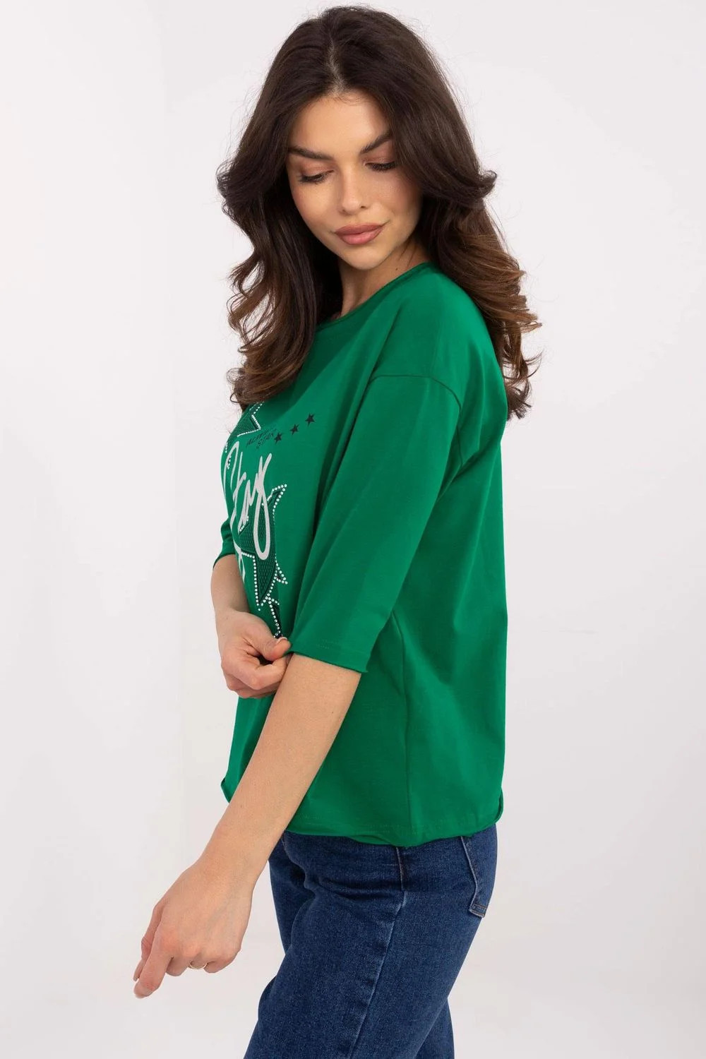 Elegantní každodenní blůzka standardní délky vyrobena z vysoce kvalitní bavlny s přídavkem elastanu, co zaručuje pohodlí a skvělé padnutí. Model s 3/4 rukávem a kulatým výstřihem je univerzální volbou na každou příležitost. Dominantní vzor kombinuje potisk s nápisy, co dává blůzce módní a moderní charakter. Dekorativní korálky vpředu dodávají jemný lesk, zdůrazňující výjimečný styl. Ideální pro každodenní outfit, skvěle se hodí jak k džínám, tak k elegantním kalhotám nebo sukní.