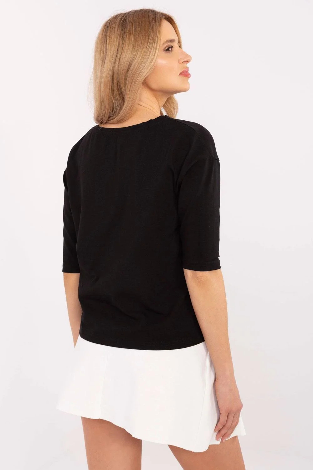 Casual dámská halenka s standardní délkou, vyrobená z příjemné bavlny s přídavkem elastanu, co zajišťuje pohodlí a ideální přizpůsobení postavě. Model s 3/4 rukávem a kulatým výstřihem je nadčasovou volbou na každý den. Dominantní vzor v podobě potisku a nápisů dodává halence módní a moderní charakter. Skvěle se hodí do každodenních stylizací, hodí se jak k džínám, tak k sukním nebo materiálovým kalhotám.