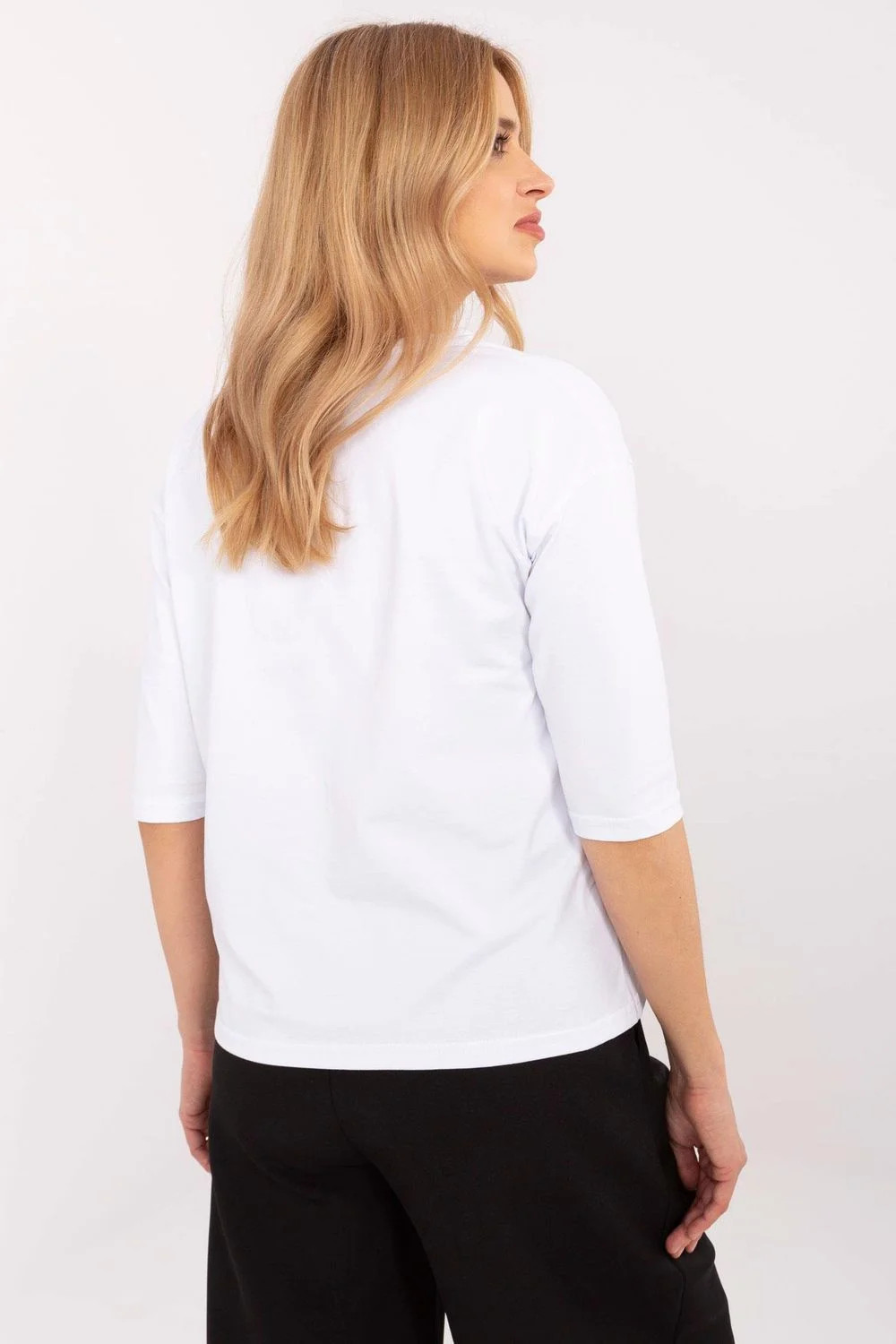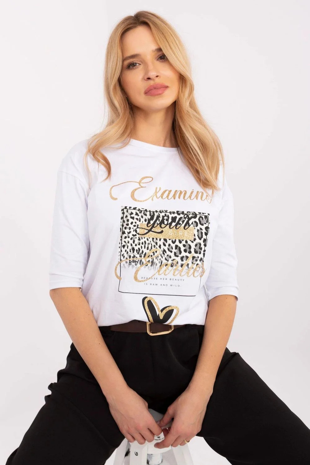 Stylový každodenní top s standardní délkou, vyrobený z měkké bavlny s přídavkem elastanu, co zajišťuje pohodlí a ideální přiléhavost. Model s 3/4 rukávem a kulatým výstřihem je univerzální volbou pro každou příležitost. Dominantní vzor spojuje potisk s motivem zvířat na přední straně, dávající topu módní a výrazný charakter. Skvěle se hodí k volným stylizacím, skvěle ladí jak s džínami, tak s sukničkami nebo elegantními kalhotami.