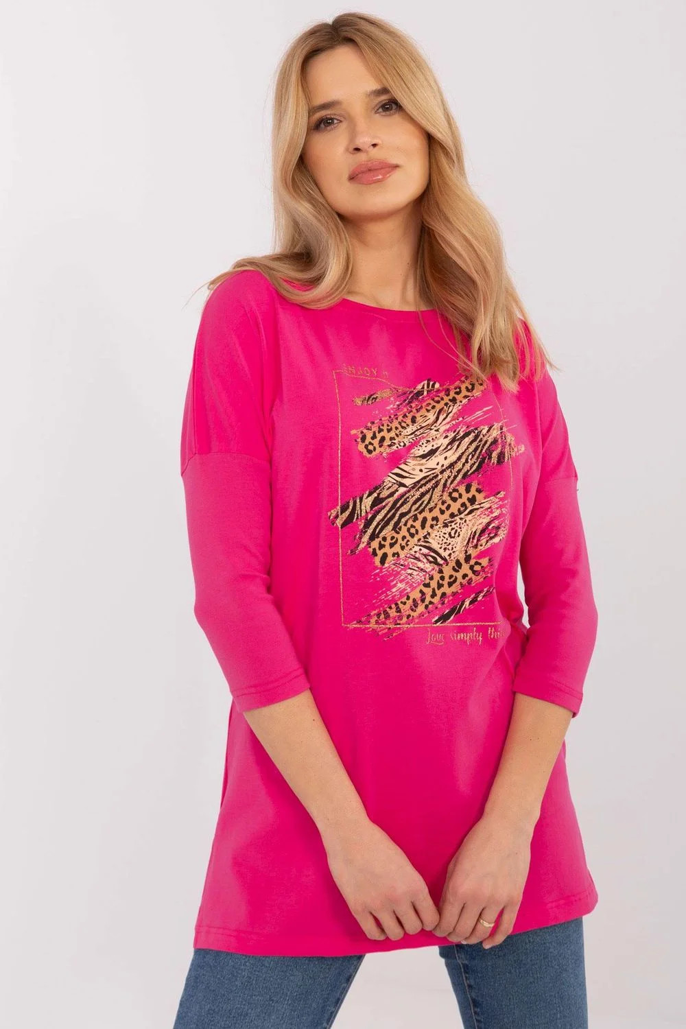 Elegantní top s prodlouženým střihem, ideální na každý den. Vyrobený z vysoce kvalitní bavlny s přídavkem elastanu, poskytuje pohodlí a volnost pohybu. Model s prodlouženou délkou, s 3/4 rukávem a kulatým výstřihem, skvěle se hodí do různých stylizací. Dominantní vzor s motivem zvířat vpředu jí dodává módní a výrazný charakter. Skvěle se hodí k legínám, džínům nebo přiléhavým kalhotám, ideální pro ženy, které oceňují pohodlí a styl.