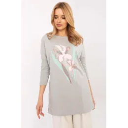 Elegantní blůza s prodlouženým střihem, skvělá na každý den. Vyrobena z vysoce kvalitní bavlny s přídavkem elastanu, zaručuje pohodlí nošení a ideální přizpůsobení. Model s delší délkou, s 3/4 rukávem a klasickým kulatým výstřihem, kombinuje pohodlí a styl. Přední část zdobí decentní potisk květinami, dodávající blůze ženský a romantický charakter. Skvěle ladí jak s legíny, džíny, tak i se slim fit kalhotami, vytvářející moderní a volnou stylizaci.