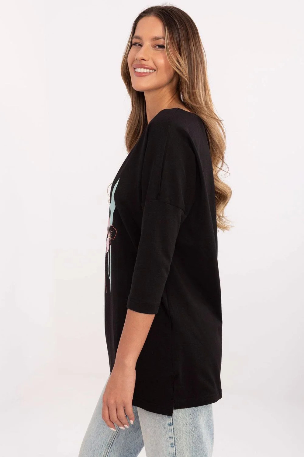 Casual dámský top, který kombinuje pohodlí s módním akcentem. Vyrobený z měkké a elastické směsi bavlny a elastanu, poskytuje pohodlí při nošení a skvěle padne k postavě. Standardní délka s kulatým výstřihem a 3/4 rukávy, které jsou vyrobeny z hrubšího materiálu. Potisk na přední straně dodává topu charakter a originální vzhled. Ideální na každý den, skvěle se hodí jak do volných, tak do ženských stylizací.