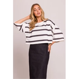 Krátká oversized mikina s proužkovaným potiskem je ideální volbou pro každodenní outfit s nádechem pohodlí. Vyznačuje se širokými rukávy délky 3/4, které jí dodávají originální vzhled, a dekoltem ve tvaru lodičky, který decentně zdůrazňuje ramena. Vyrobená z měkké pleteniny zajišťuje pohodlí a komfort po celý den. Mikina byla navržena a ušita v Polsku, co zaručuje vysokou kvalitu a preciznost provedení. Ideální k nošení s džínami, sukní nebo sportovními kalhotami, hodí se jak na každodenní, tak na elegantnější příležitosti.