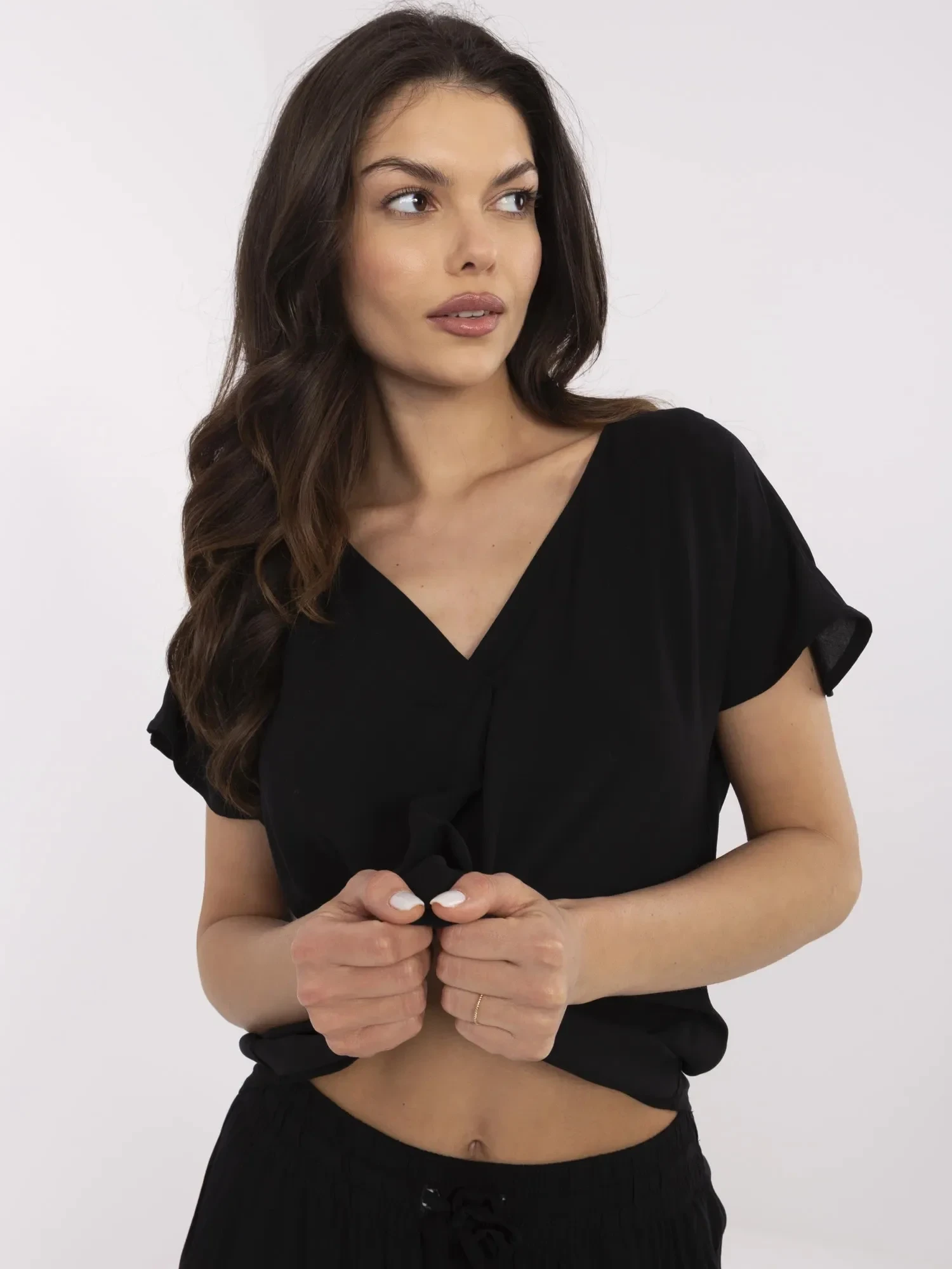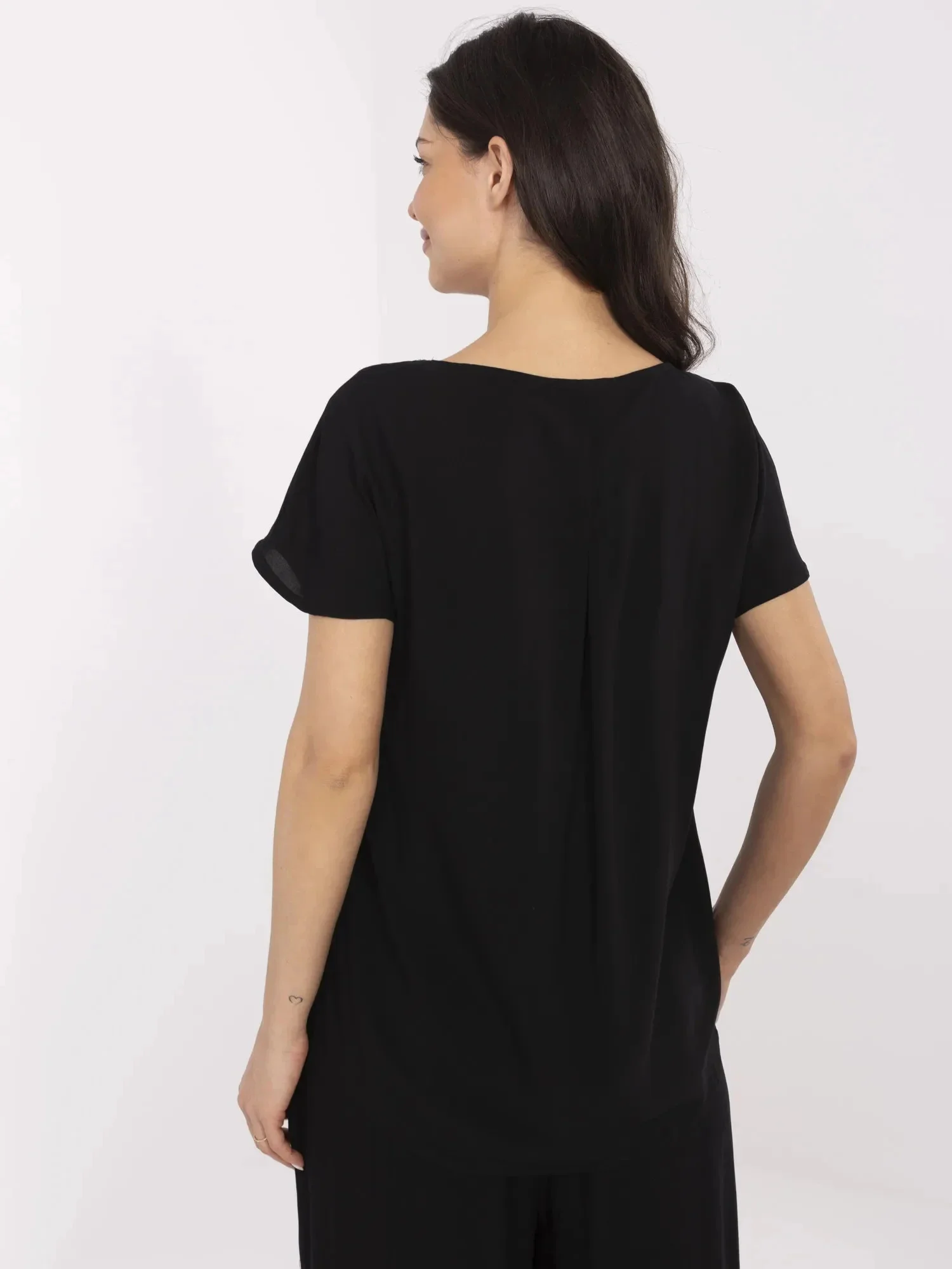 Wymiary bluzki w rozmiarze S mierzone na płasko: szerokość pod pachami - 53 cm, długość rękawa - 22 cm, szerokość w biodrach - 56 cm, długość całkowita - 60 cm (przód), długość całkowita - 67 cm (tył).