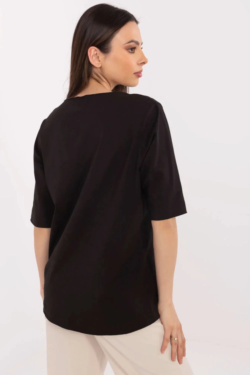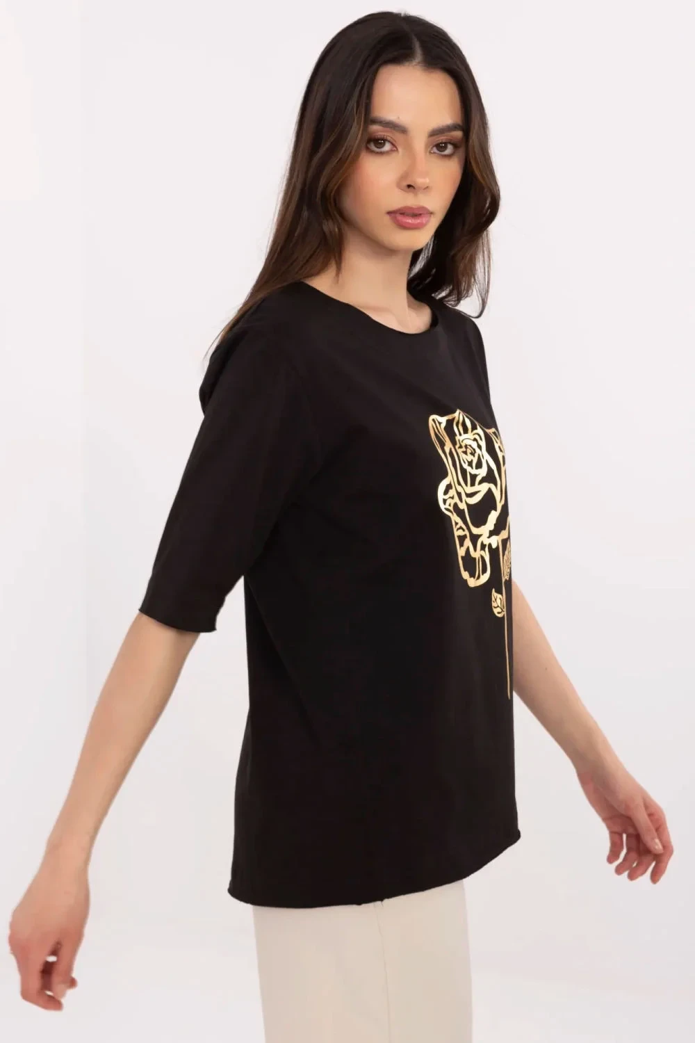 Casual dámská halenka ideální na každodenní stylizace. Vyrobená z příjemné směsi bavlny a elastanu, poskytuje pohodlí nošení a skvělé přizpůsobení postavě. Halenka má standardní délku, krátký rukáv a klasický, kulatý výstřih, který se hodí do mnoha univerzálních kombinací. Dominantním prvkem je jemný potisk ve tvaru růže, který dodává celku ženského šarmu a jemné elegance. Skvělá volba pro ženy, které ocení pohodlí spojené s módním akcentem v každodenním provedení.