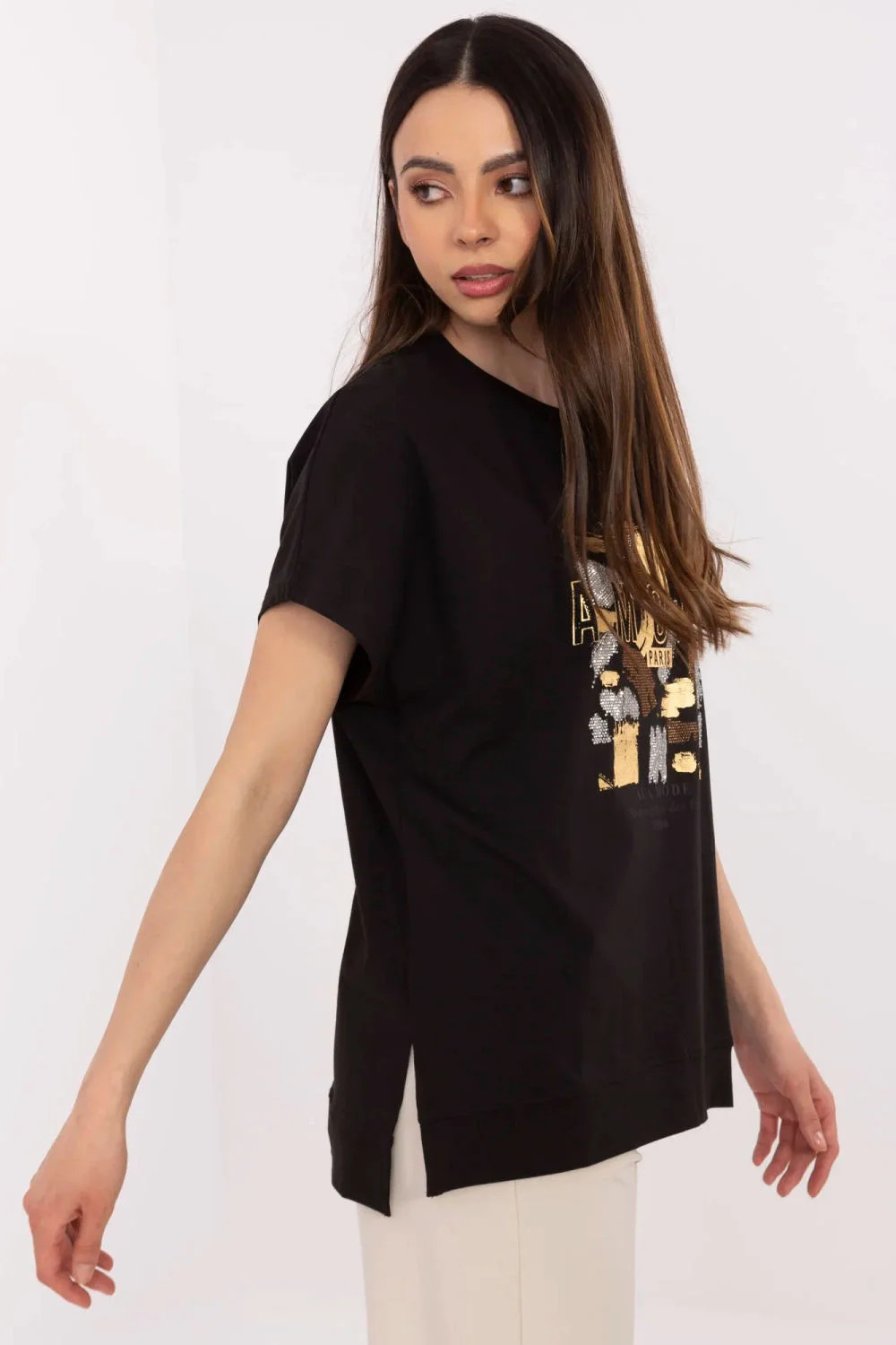 Každodenní dámská košile Casual ideální na denní stýlování. Vyrobena z vysoce kvalitní směsi bavlny a elastanu, zaručuje pohodlí nošení a volnost pohybu. Model standardní délky s krátkým rukávem a klasickým kulatým výstřihem skvěle zapadne do mnoha každodenních outfitů. Košili zdobí efektní potisk obohacený aplikací a drobnými flitry, které dodávají celku jemný lesk a moderní charakter. Ideální volba pro ženy, které rády spojují pohodlí se subtilními, módními detaily.
