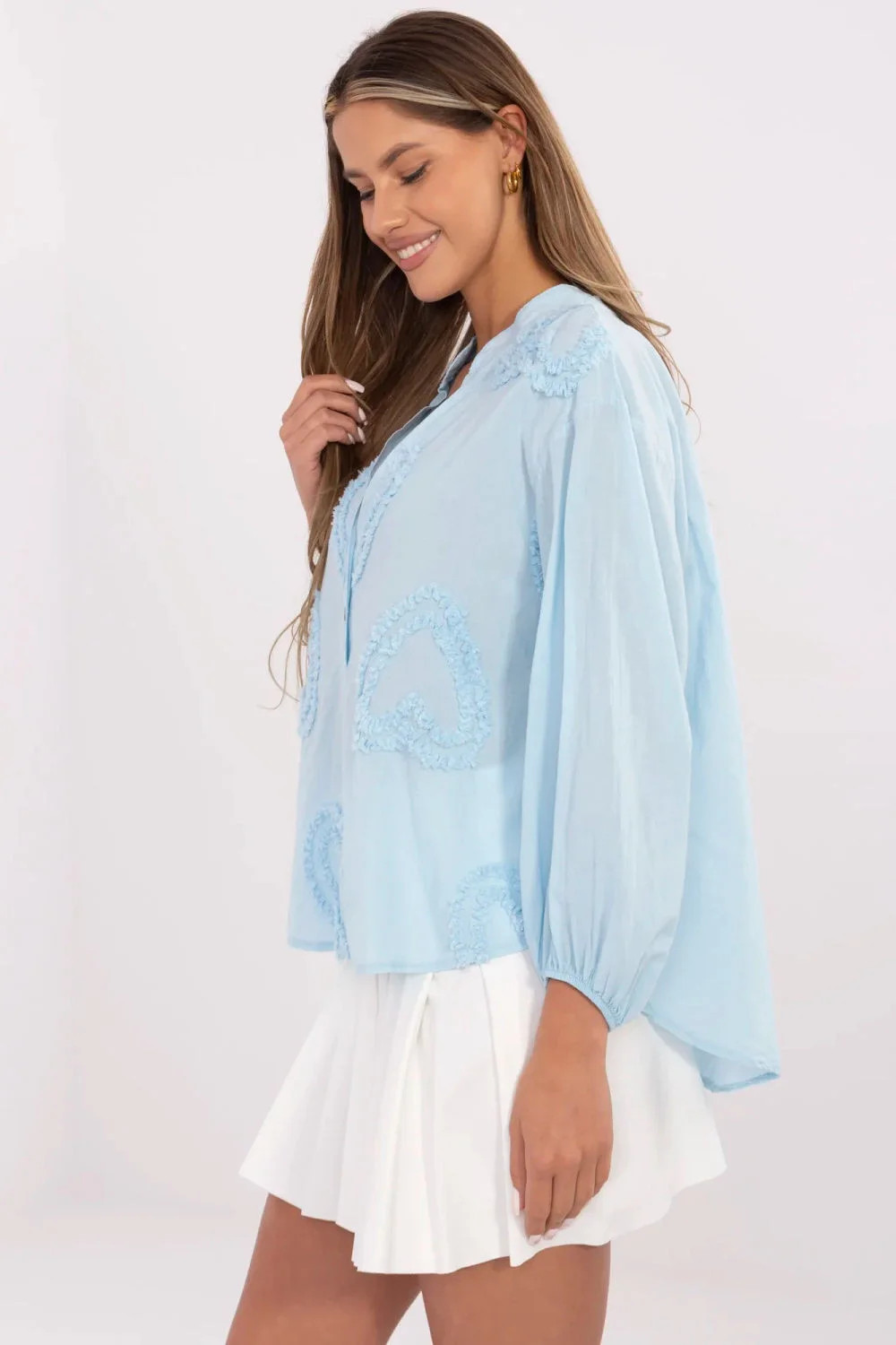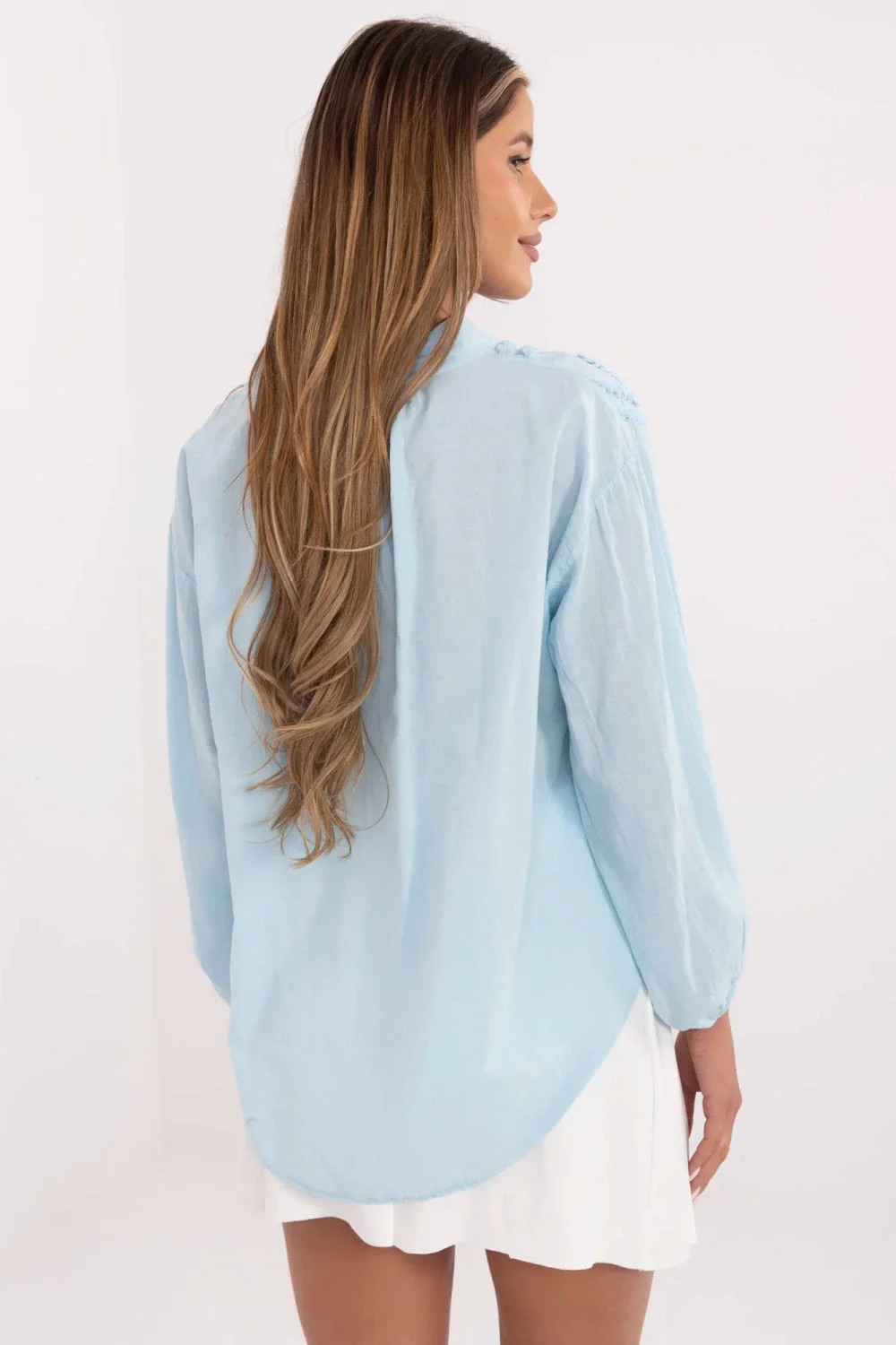 Stylová a ženská blůza v boho stylu je skvělou volbou na každý den, do práce a dokonce i na více formální příležitosti. Vyrobená z bavlněného materiálu s různorodou strukturou, okouzluje jemným zpracováním a péčí o detaily. Standardní délka, dlouhý nafouklý rukáv zakončený elastickým lemem a stojáček s výstřihem do srdíčka vytvářejí velmi harmonický celek. Zapínání na dva knoflíky dodává lehkost a eleganci. Jedná se o univerzální model, který skvěle kombinuje pohodlí s módním, uvolněným charakterem boho.
