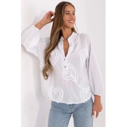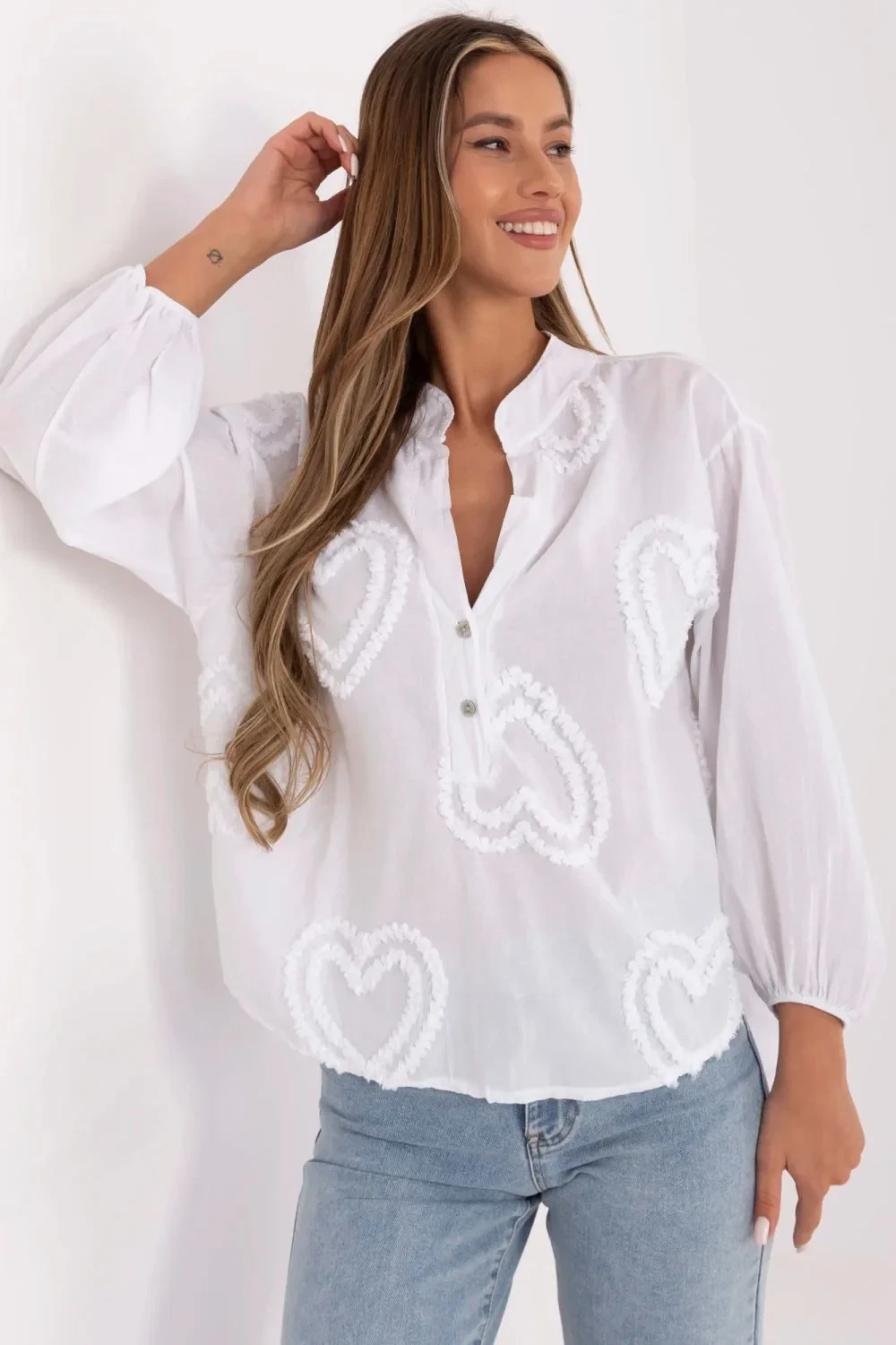 Elegantní a ženská blůza ve stylu boho je skvělou volbou na každý den, do práce nebo i na více formální události. Vyrobená z bavlněného materiálu s různými texturami, okouzlí jemným zpracováním a péčí o detaily. Standardní délka, dlouhý nafouklý rukáv se zakončením na gumu a stojáček s výstřihem do V tvoří velmi harmonický celek. Zavírání na dva knoflíky dodává lehkost a eleganci. Jedná se o univerzální model, který skvěle spojuje pohodlí s trendy a uvolněným boho charakterem.