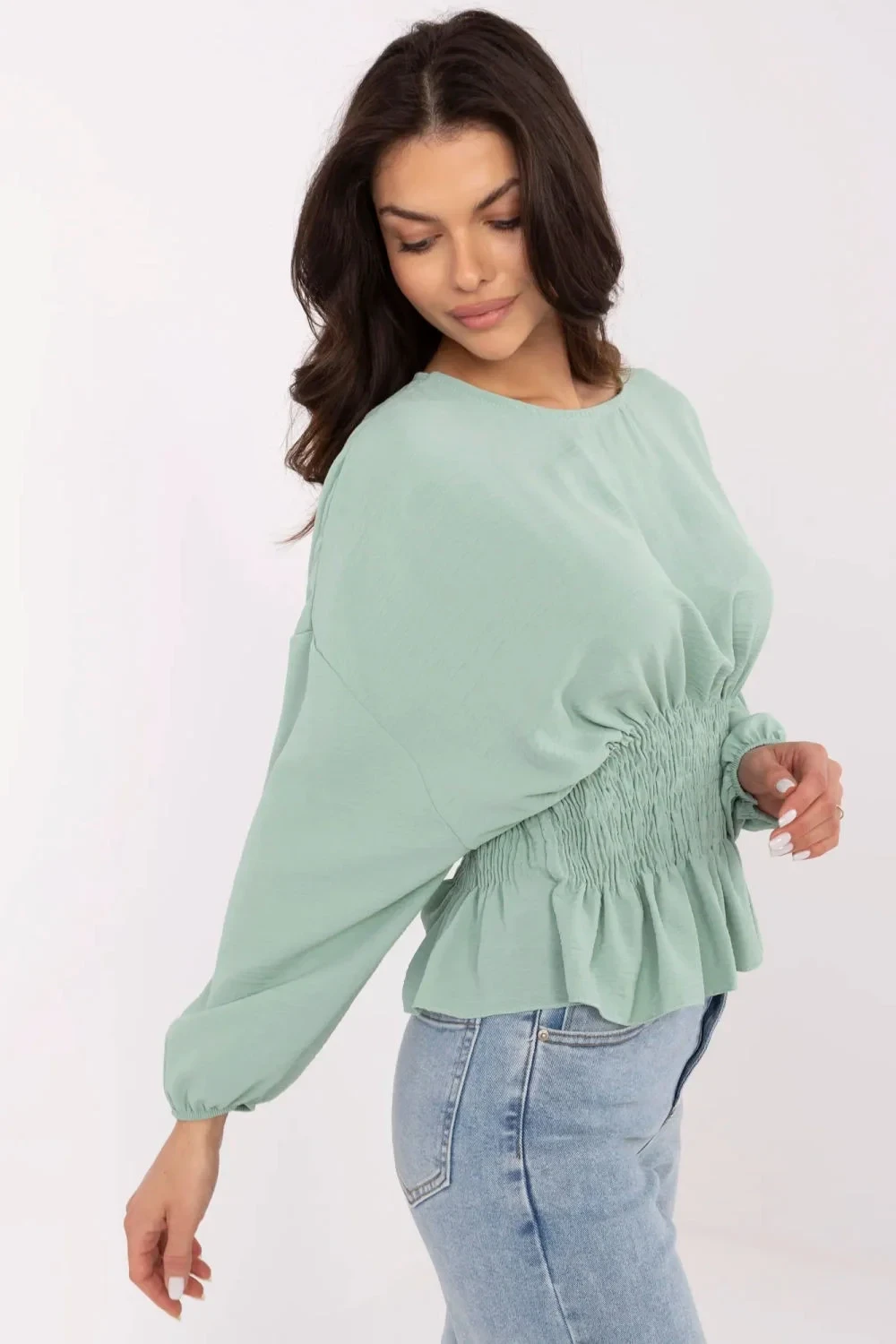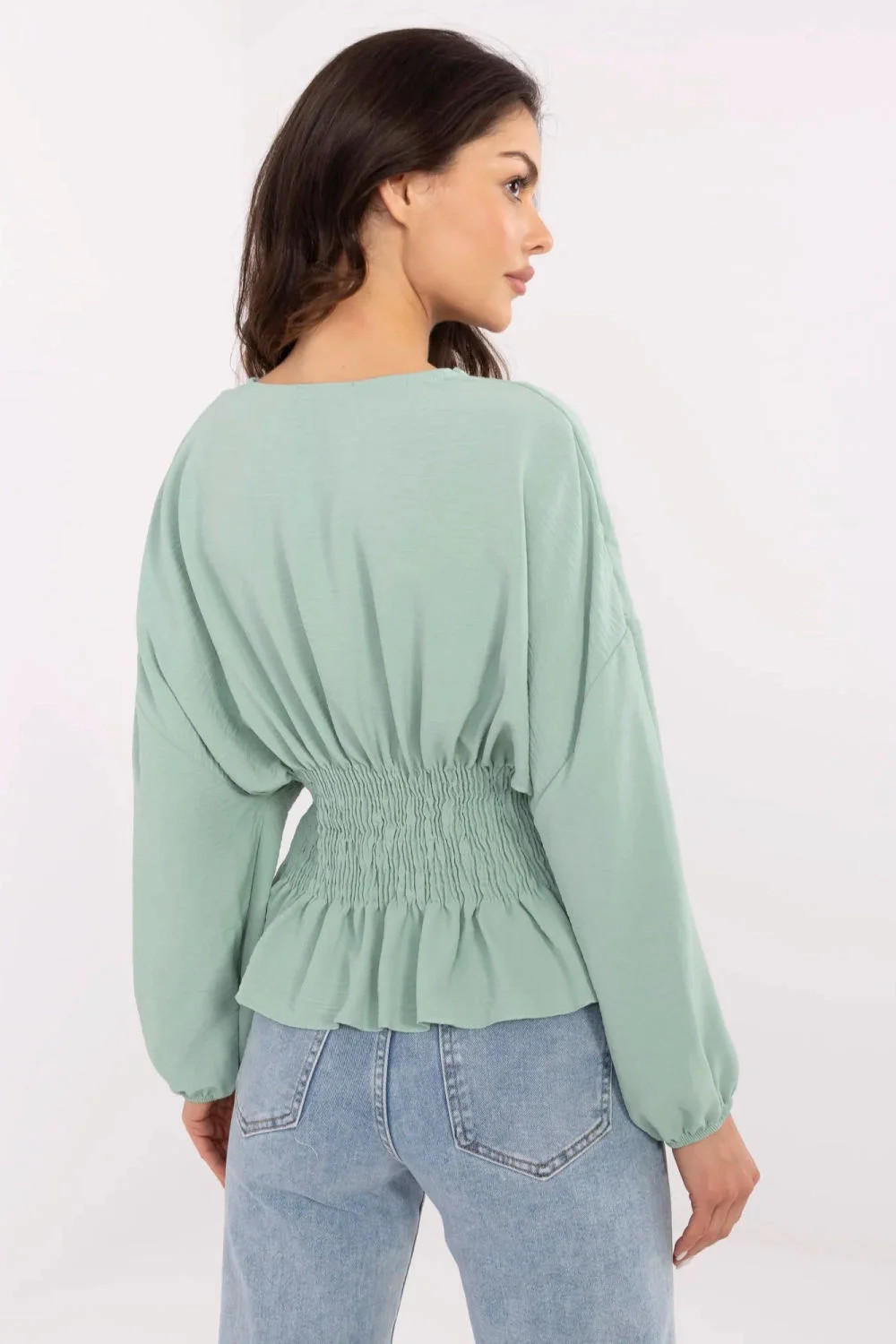 Krátká, elegantní blůza je stylovým návrhem na každý den, do práce i na slavnostní příležitosti. Vyrobená z hladkého, lehkého polyesteru spojuje pohodlí s elegantním vzhledem. Model ohromuje ozdobnými záhyby běžícími od linie prsou až k pasu, které jemně modelují postavu a dodávají jí ženský charakter. Bubnovité, dlouhé rukávy dodávají celku romantický výraz, a klasický kulatý výstřih zdůrazňuje elegantní styl blůzy. Bez zapínání je model pohodlný a snadno se obléká. Ideální k sukni nebo kalhotám s vysokým pasem.