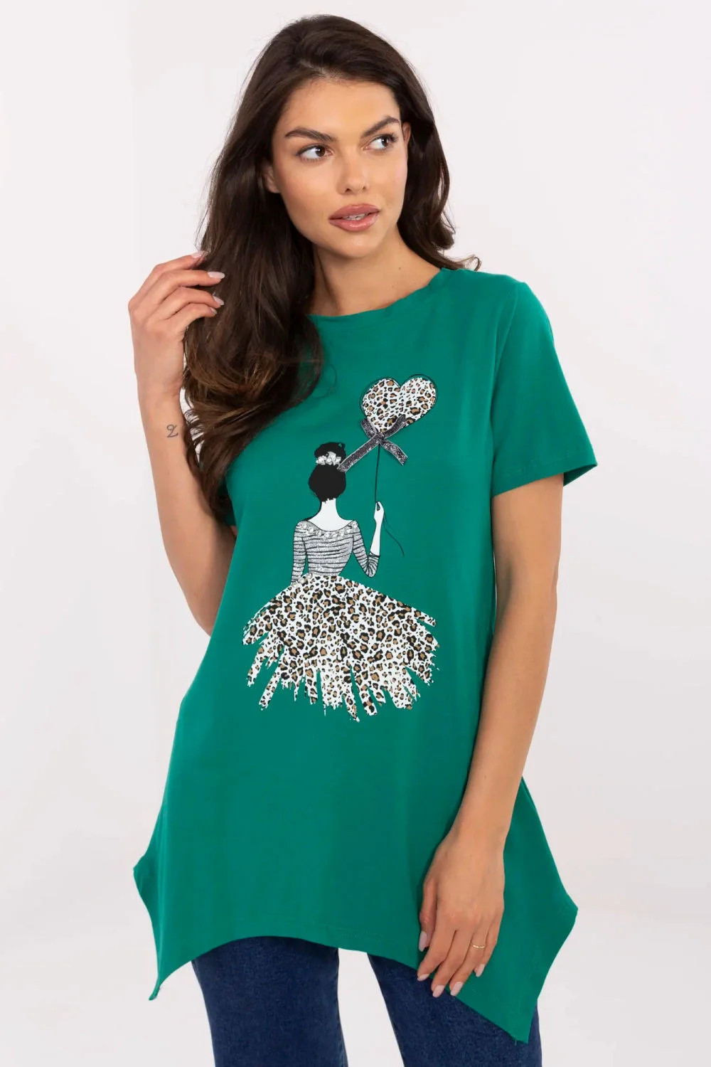 Casual dámský top ideální na každý den, kombinující pohodlí s módním vzhledem. Vyrobený z vysoce kvalitní směsi bavlny a elastanu, poskytuje pohodlí a ideální přiléhavost k postavě. Standardní délka modelu s krátkým rukávem a klasickým kulatým výstřihem. Bez zapínání je top velmi pohodlný na oblékání. Dominantní vzor a potisk v motivu zvířat přitahují pozornost, a aplikace z jete a zirkonů dodávají topu výjimečný lesk a originální charakter. Skvělý návrh pro ženy, které ocení pohodlí a módní, nekonvenční styl na každý den.
