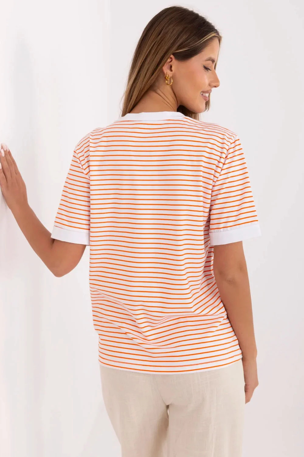 Pohodlný a stylový top s casual charakterem, ideální na každý den i do práce. Vyrobený z prodyšné směsi bavlny s přídavkem elastanu, zaručuje pohodlí a jemné přizpůsobení postavě. Standardní délka a krátký rukáv dělají z tohoto kousku skvělou volbu na teplé dny, a výstřih ve tvaru V jemně zdůrazňuje krk a přidává ženský půvab. Pruhovaný vzor s potiskem dodává celku moderní akcent, ideální pro ženy, které rády spojují pohodlí s výrazným stylem. Skvěle ladí jak s džíny, tak s sukni, nezbytný kousek v každodenní šatníku!