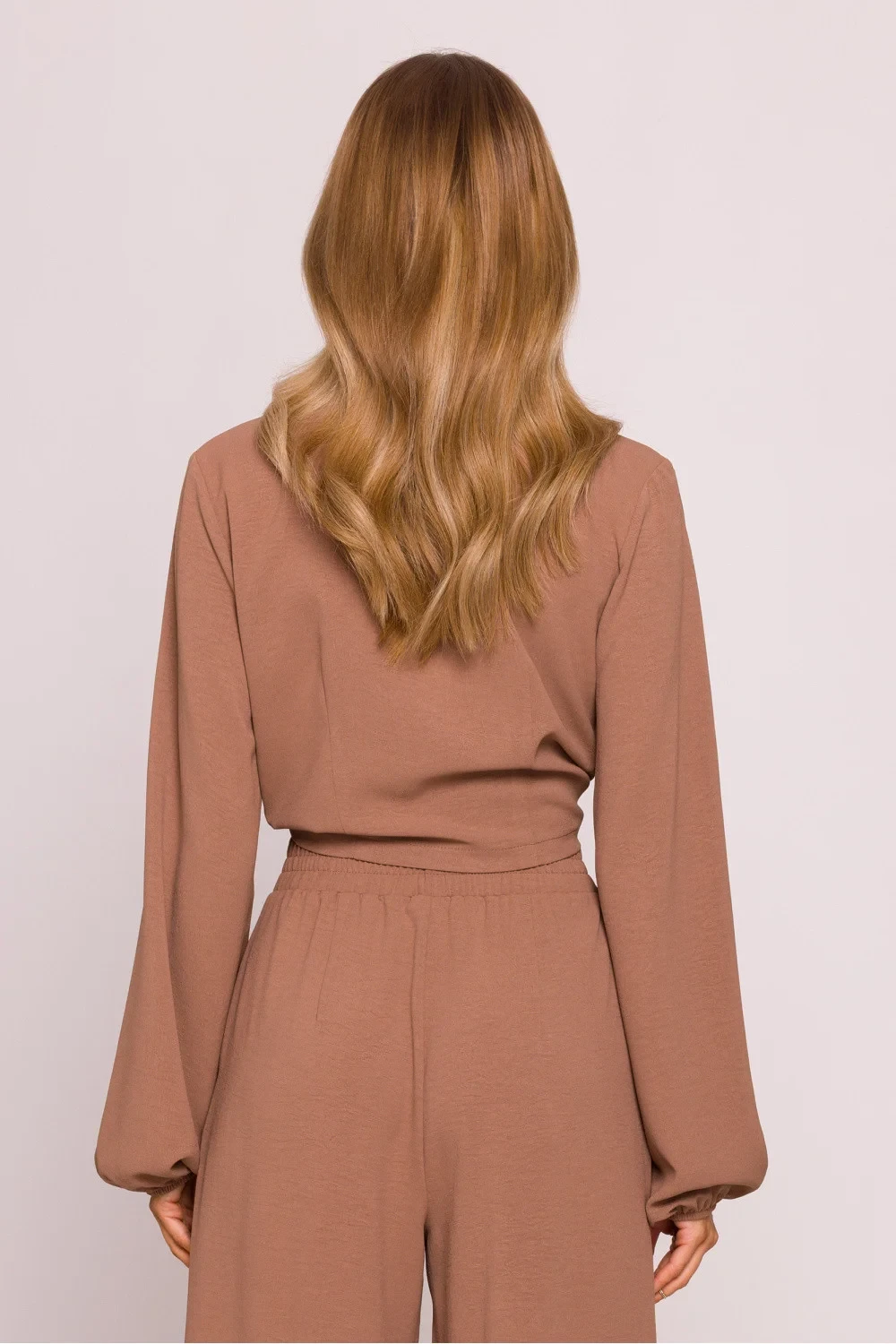Elegantní top vyrobený z lehké, kreptové látky s výraznou strukturou a matným finišem. Krátký střih typu crop top, který končí v pasu, krásně zdůrazňuje postavu a skvěle ladí jak s vysokým pasem, tak s vrstvenými stylizacemi. Model vyniká hlubokým výstřihem ve tvaru písmene V, zapínáním na diskrétní zip a s možností předního zavázání, tvořící asymetrický, volný uzel. Dlouhé nadýchané rukávy s elastickým lemem dodávají topu lehkost a romantický charakter. Navrženo a ušito v Polsku s důrazem na detaily a pohodlí nošení.