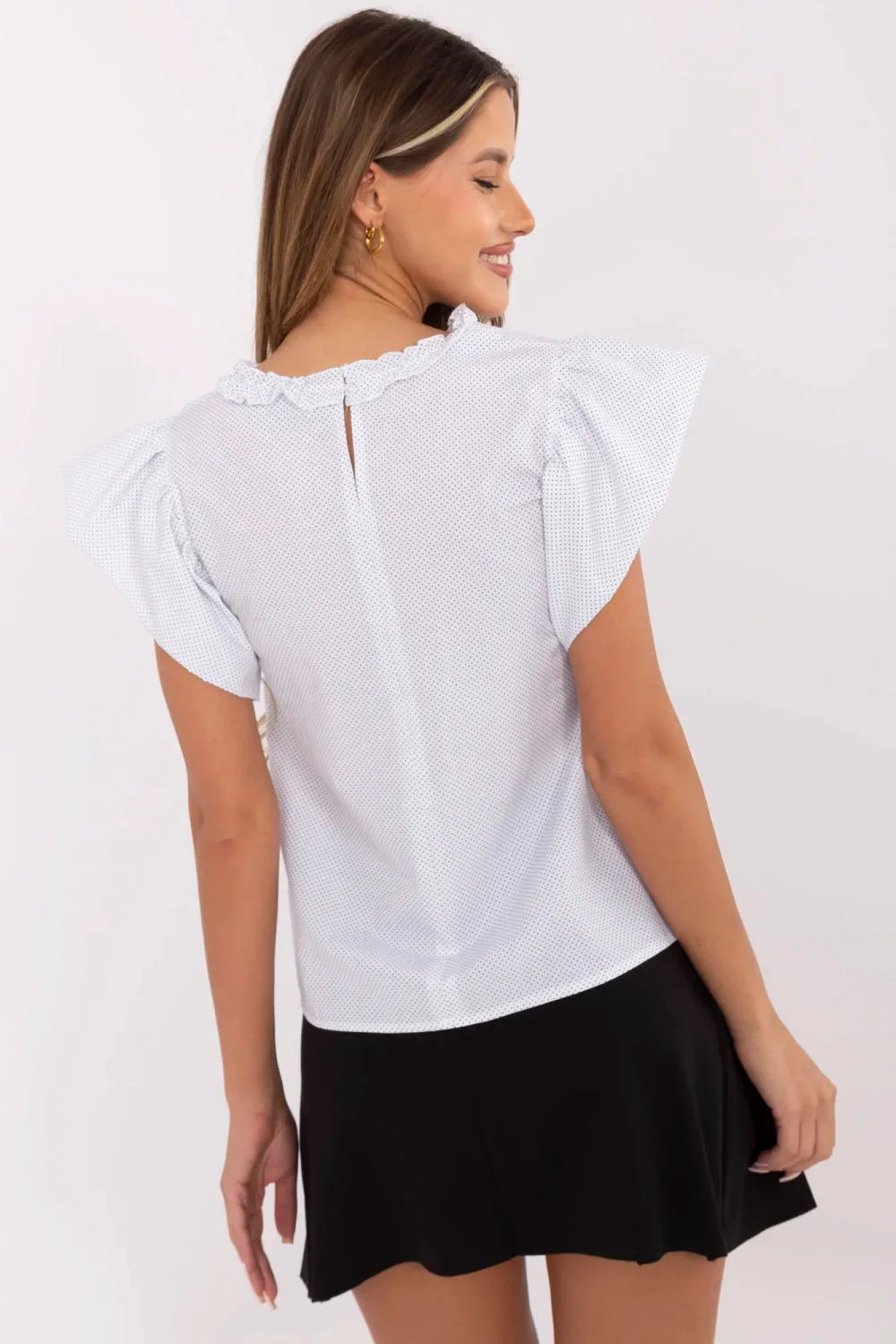Elegantní halenka se drobnými puntíky je skvělou volbou na návštěvy a stylové outfit do práce. Vyrobená z prodyšné, dominantní bavlny poskytuje pohodlí po celý den, zatímco vypadá žensky a elegantně. Model se standardní délkou okouzluje jemnými detaily, kulatý výstřih je zdobený drobnou ozdobnou volánkou, která celku dodává něžného šarmu. Krátké rukávy ve formě volánků dodávají halence lehkost a romantický charakter. Klasický vzor s malými puntíky zdůrazňuje elegantní styl a zároveň dodává trochu svěžesti. Halenka skvěle ladí s cigaretovými kalhoty, tužkovou sukní nebo elegantními kalhotami, vytvářejíc outfit ideální jak na formální schůzky, tak i na každodenní výlety do práce.