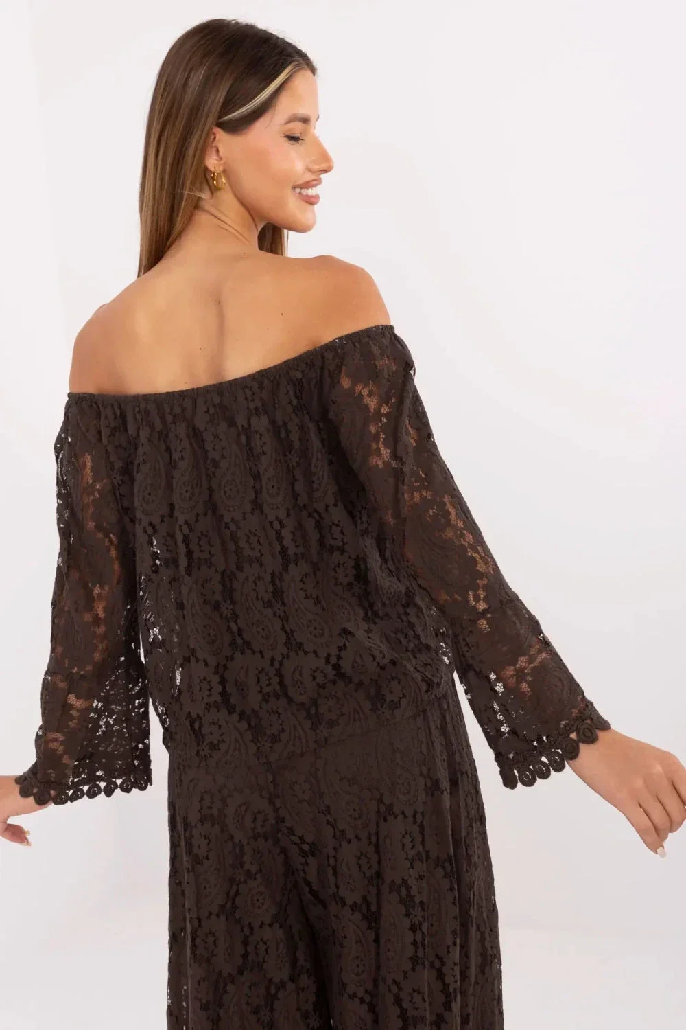 Elegantní blůzka z krajkového ažuru je ženskou a stylovou volbou na mnoho příležitostí, od každodenních outfitů po více formální výstupy nebo večírky. Vyrobená z vysoké kvality směsi bavlny a nylonu, s jemnou podšívkou, zajistí pohodlí nošení a efektní dokončení. Krátká délka a španělský výstřih nádherně zdůrazňují ramena, dodávají celku smyslný charakter. Dlouhé rukávy z jemné krajky dodávají lehkost, a šněrování vpředu podtrhuje pas a vnáší romantický akcent. Blůzka skvěle ladí jak s elegantními kalhotami, tak i sukní ideální na schůzky, do práce nebo večerní výlety. Jedná se o kombinaci elegance a moderního stylu, která vždy udělá dojem.