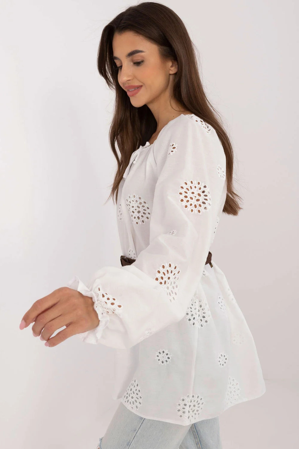 Každodenní blůza v boho stylu je kombinací pohodlí a ženského šarmu. Vyrobená z prodyšné přírodní bavlny, skvěle se hodí na každý den. Model s standardní délkou se vyznačuje ažurovým vzorem, který dodává lehkost a jemnost. Dlouhý nafouklý rukáv dává blůze charakteristický, volný vzhled. Výstřih s ozdobným vázáním zdůrazňuje romantický boho styl. Je to ideální volba k džínům, sukním nebo kraťasům, skvěle se hodí jak na procházku, tak na setkání s přáteli. Součástí je zapínací pásek.