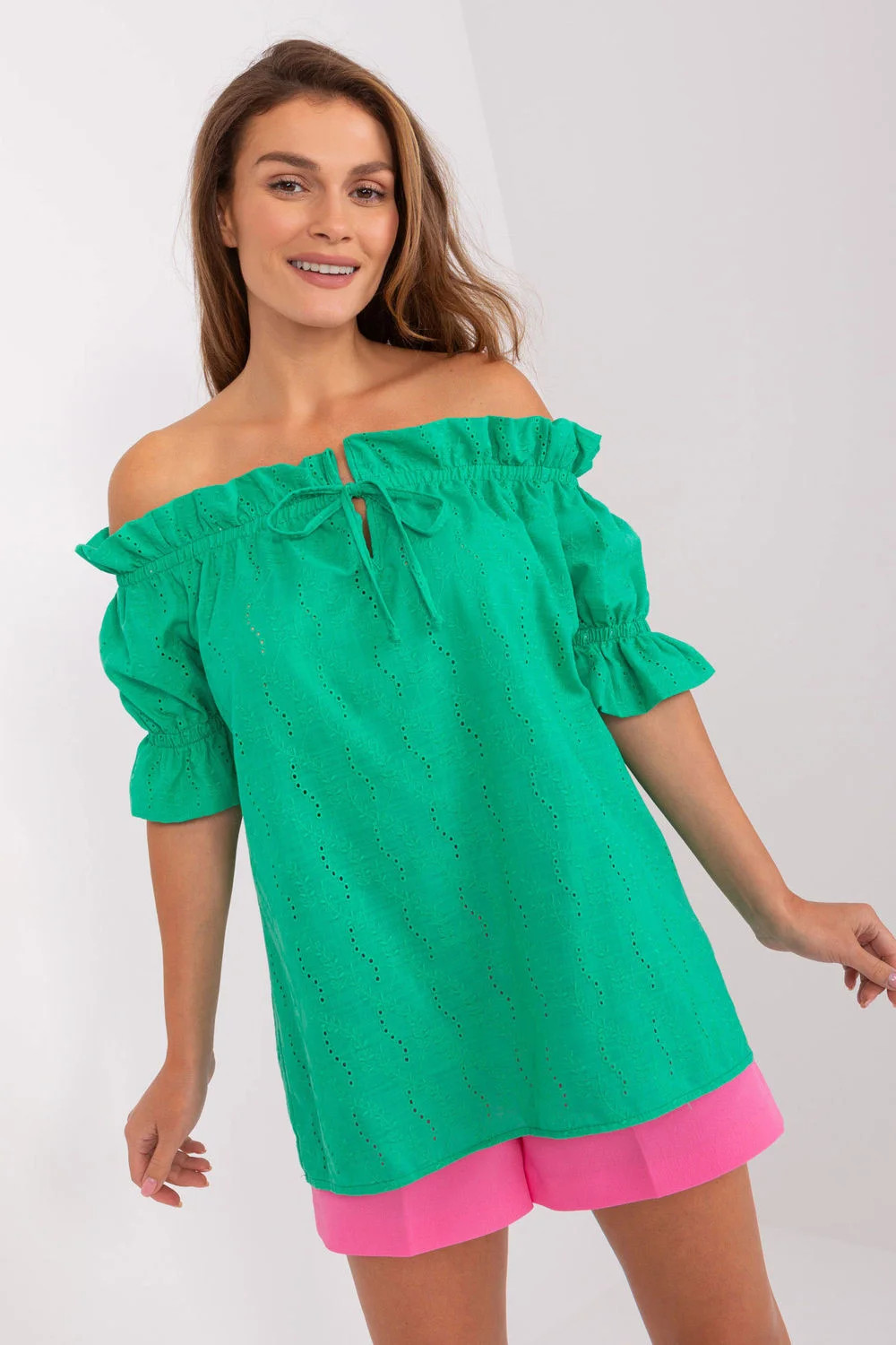 Blůza s krátkým rukávem a výstřihem ve španělském stylu. Blůza z materiálu s ažurovaným vzorem. Ideální na mnoho příležitostí.