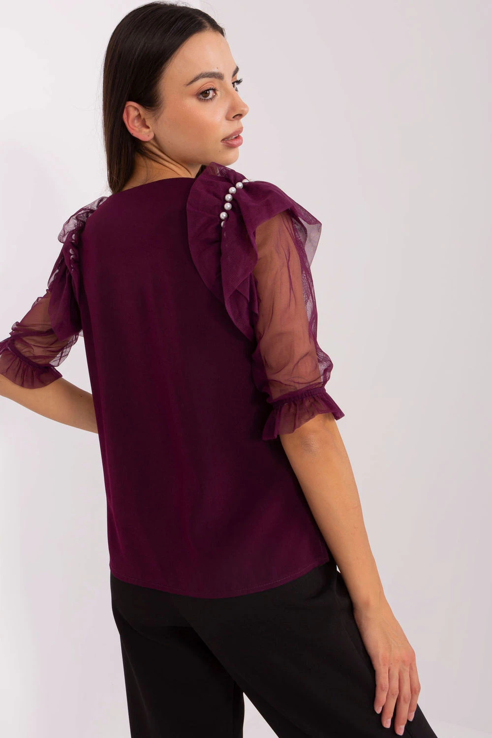 Elegantní blůza standardní délky, vyrobená z kombinace bavlny, elastanu a polyesteru, spojující pohodlí nošení s elegantním vzhledem. Hladká tkanina poskytuje ideální pozadí pro jemné ozdobné korálky umístěné na ramenech, které dodávají celku jedinečný charakter. Model s 3/4 rukávem z jemné síťoviny dodává lehkost a ženský šarm, zatímco klasický kulatý výstřih zdůrazňuje elegantní jednoduchost střihu. Skvělá na společenské události a do práce, v kombinaci jak s elegantními kalhoty, tak s sukní.